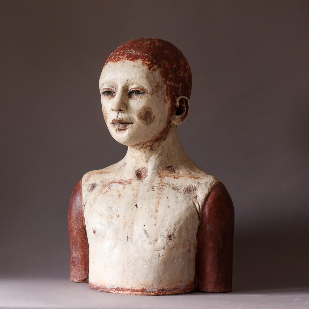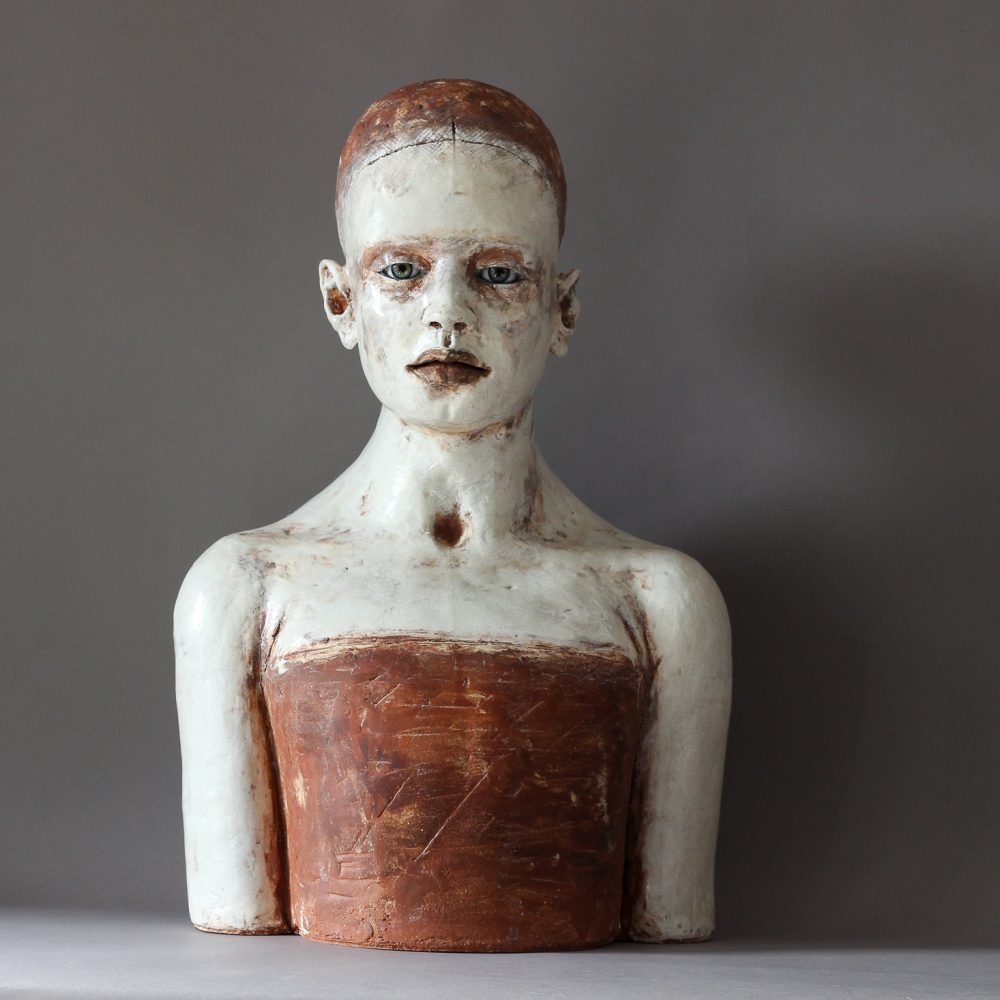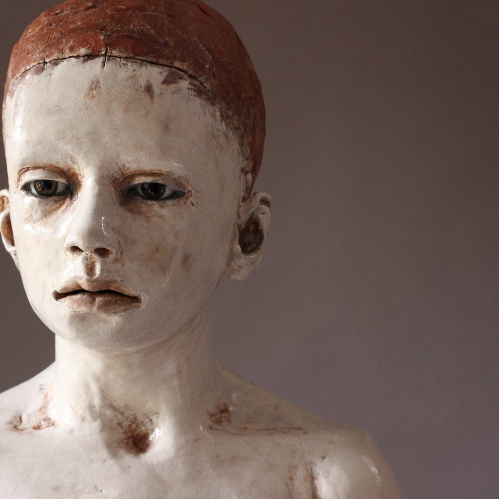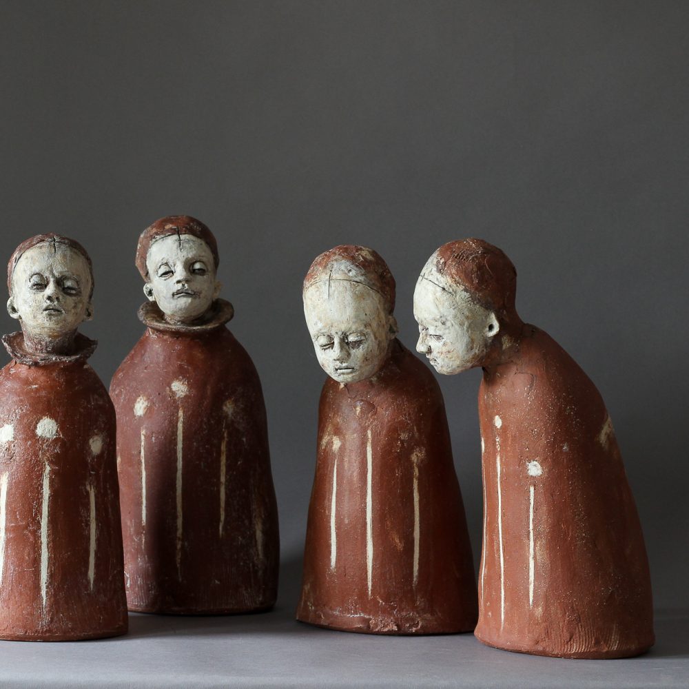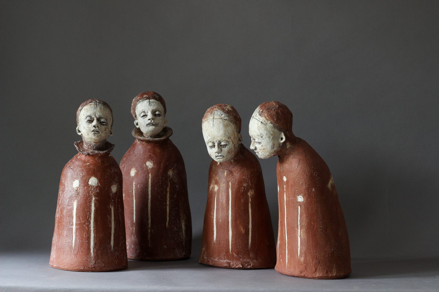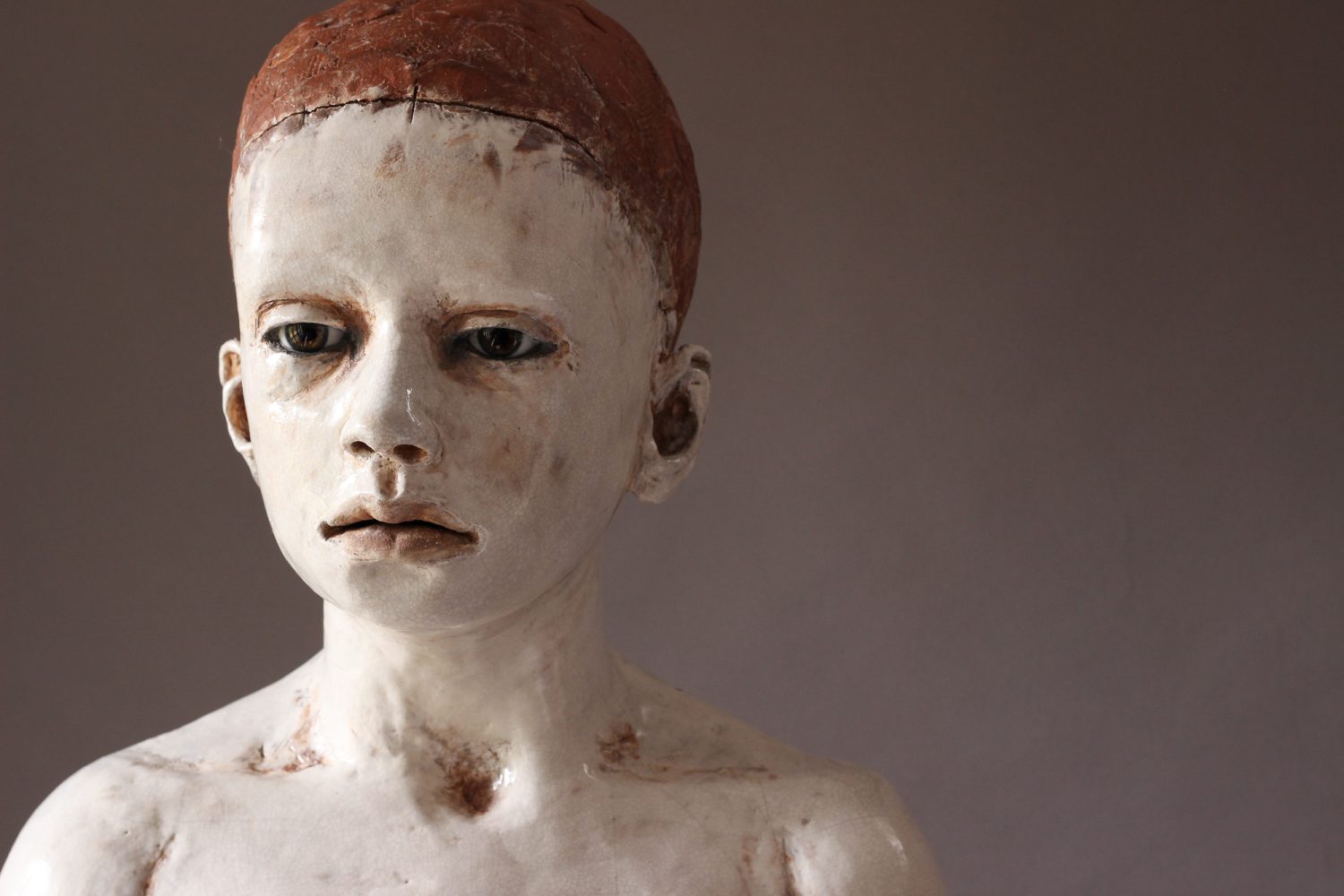 Alison Coaten’s figures bring together bodies of clay, from coarse cranks used for their strength and texture, through to smooth earthenware and slips for detail and soft flesh. Some areas are clothed with glaze whilst others remain in their naked visceral state, exposing earthy tones and the marks of their making.