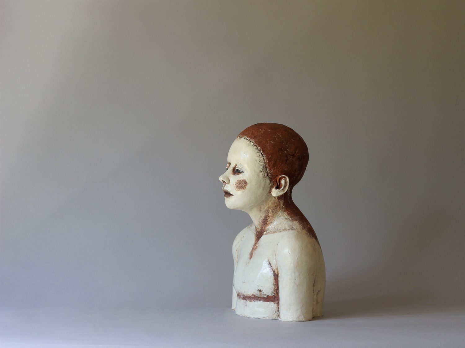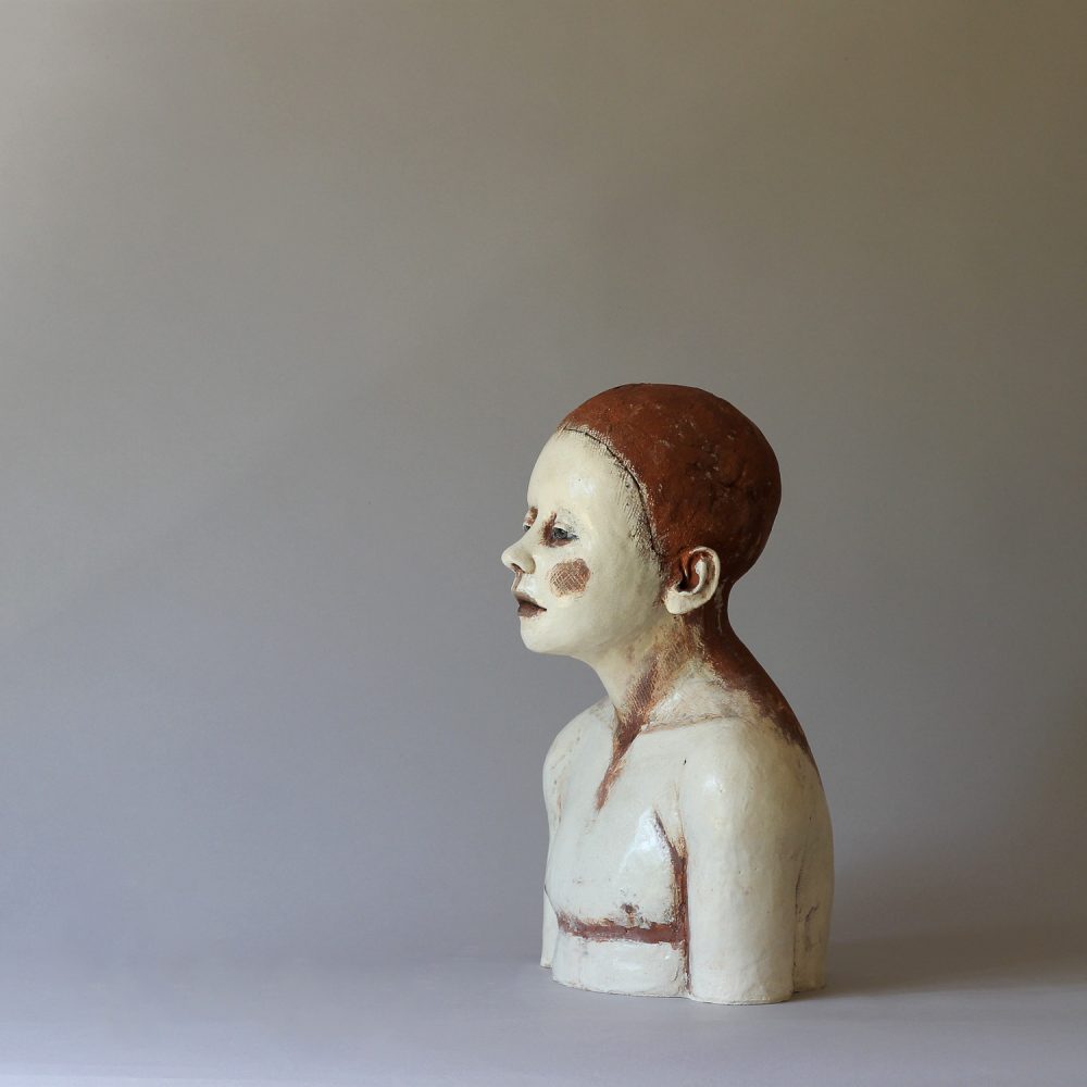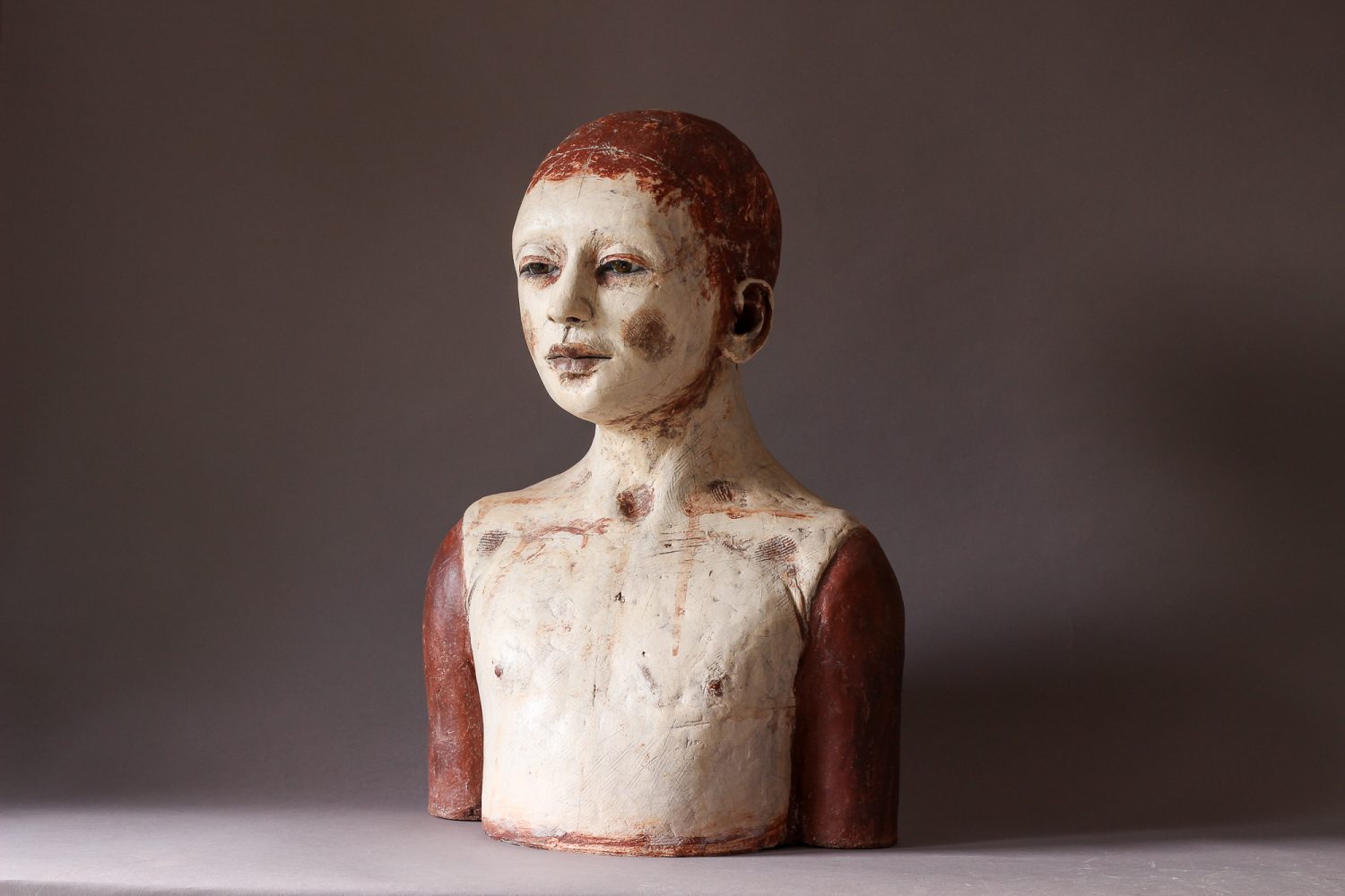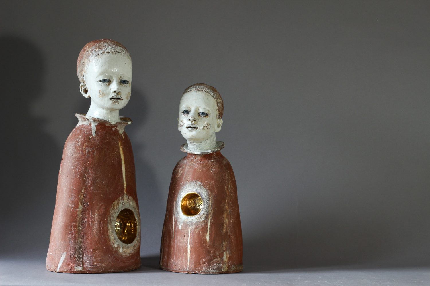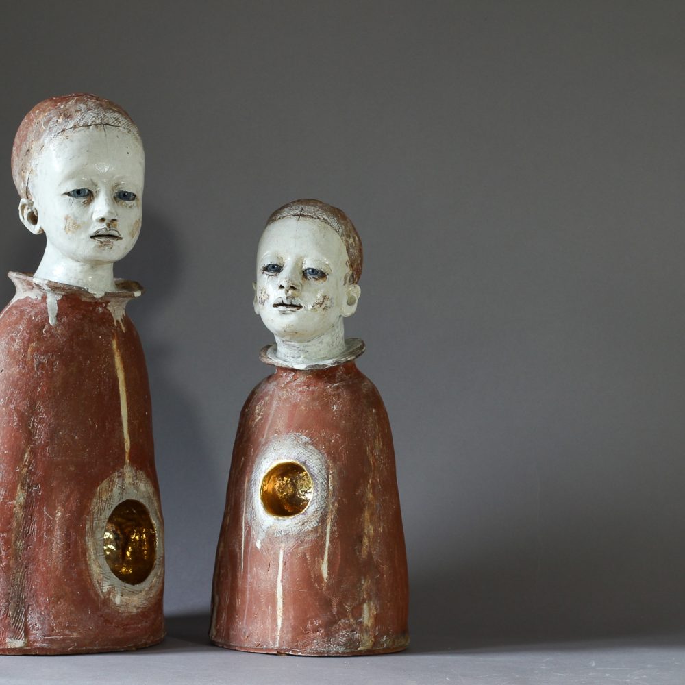 Alison Coaten’s figures bring together bodies of clay, from coarse cranks used for their strength and texture, through to smooth earthenware and slips for detail and soft flesh. Some areas are clothed with glaze whilst others remain in their naked visceral state, exposing earthy tones and the marks of their making.