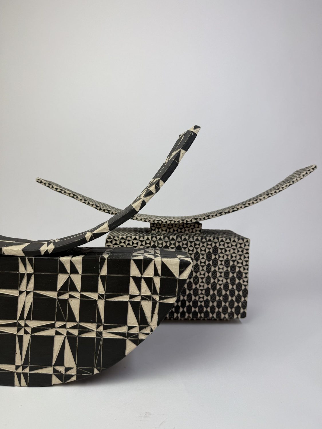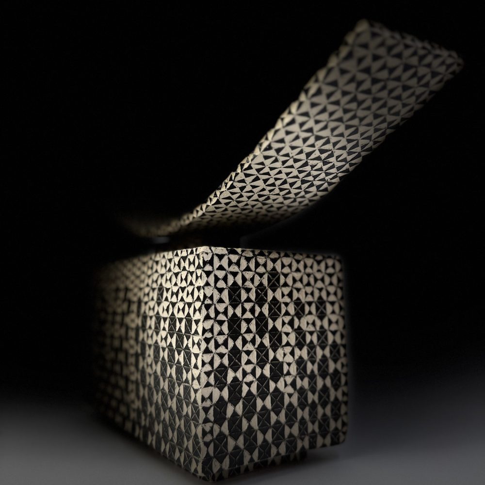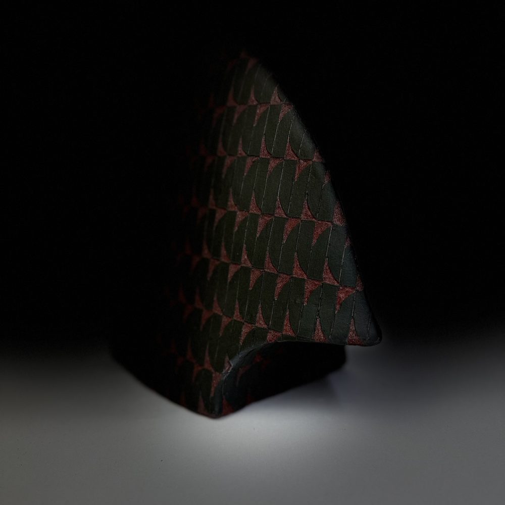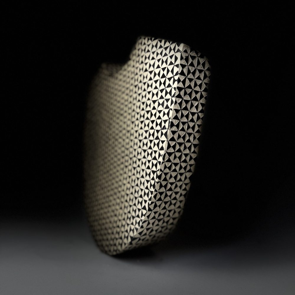 At the core is a conversation between three-dimensional form and two-dimensional pattern. Ambiguity is created by placing a rigid geometric pattern on sometimes an organic form, or vice versa, altering perception of the work.