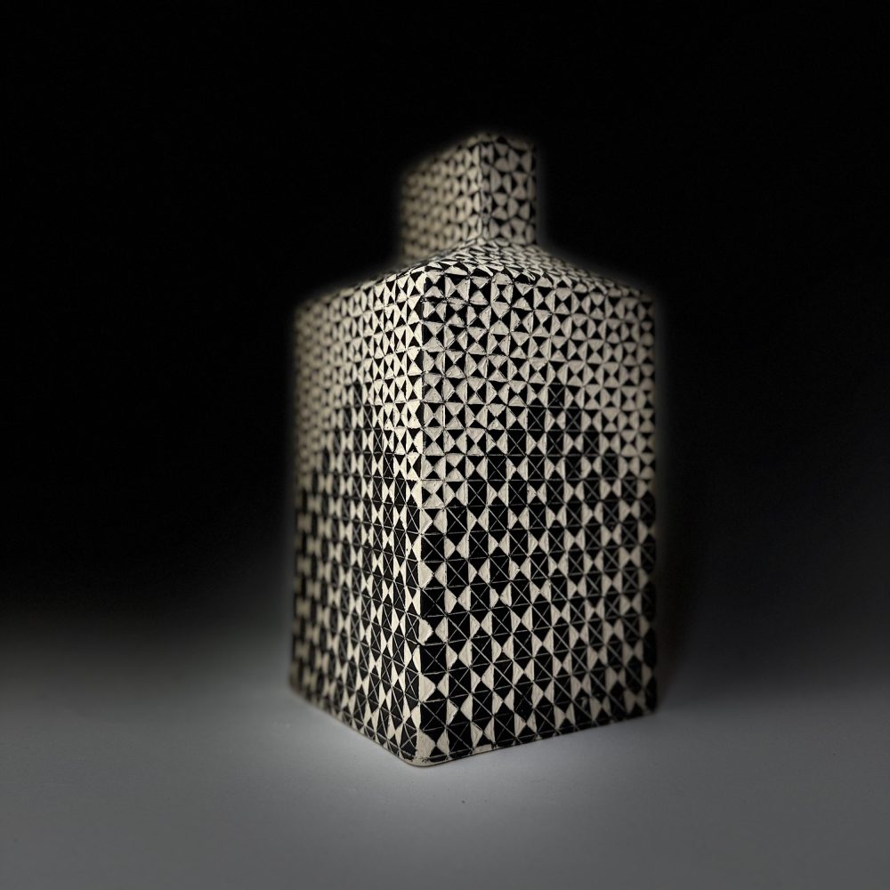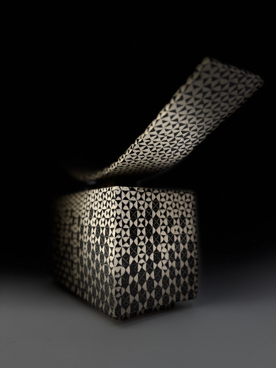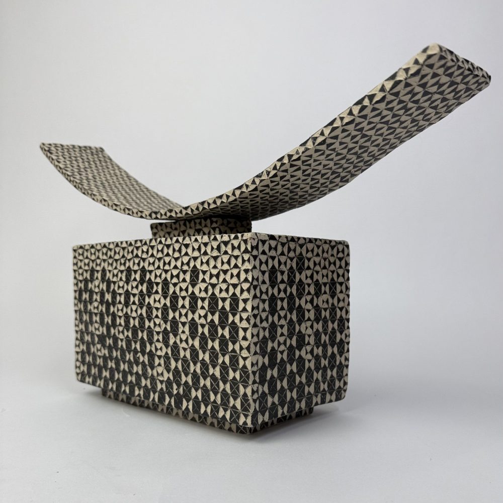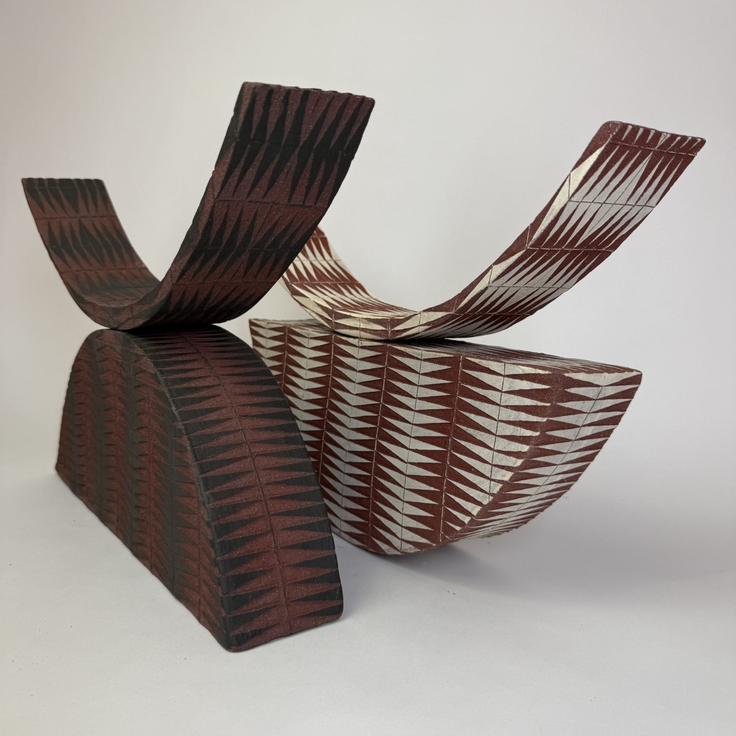 At the core is a conversation between three-dimensional form and two-dimensional pattern. Ambiguity is created by placing a rigid geometric pattern on sometimes an organic form, or vice versa, altering perception of the work.