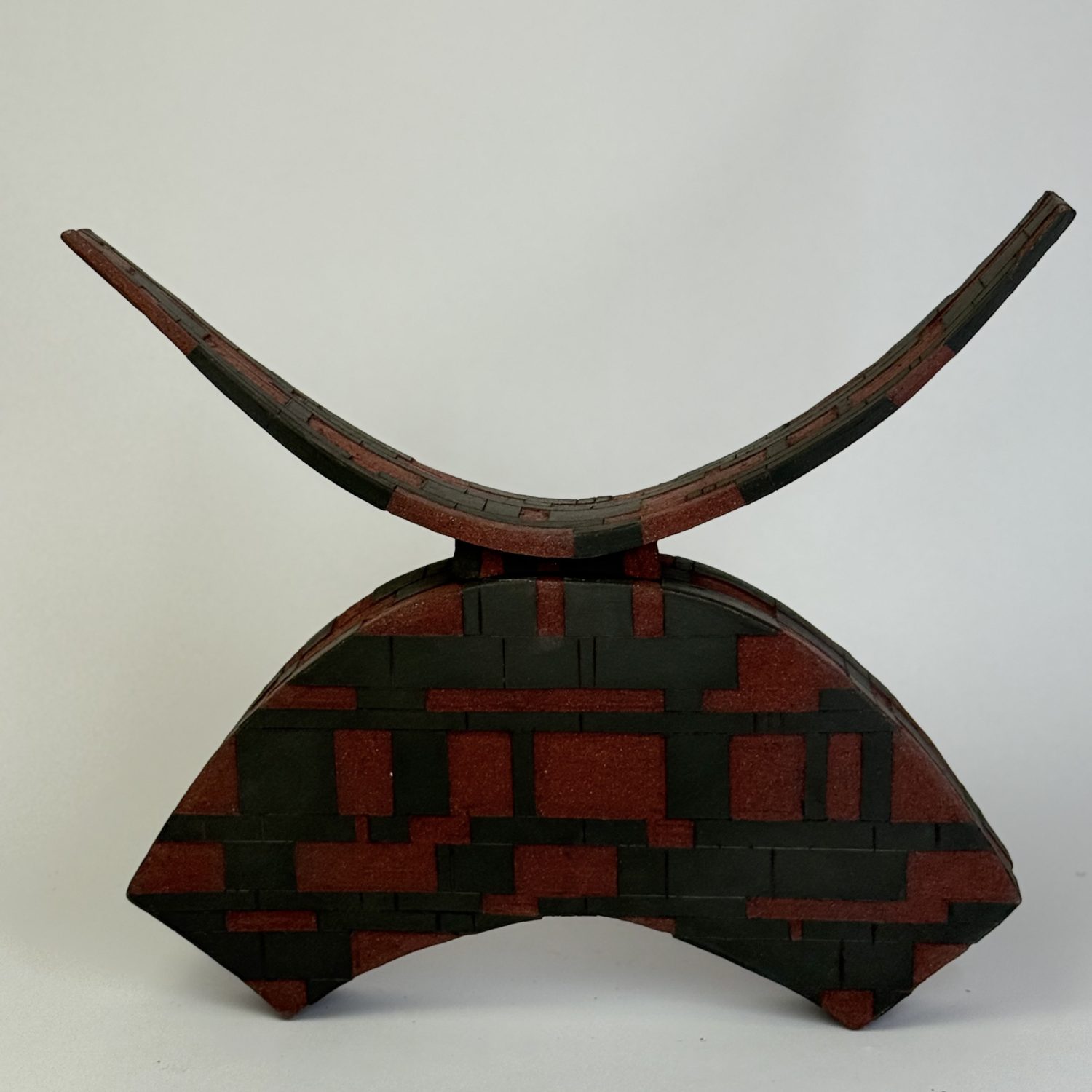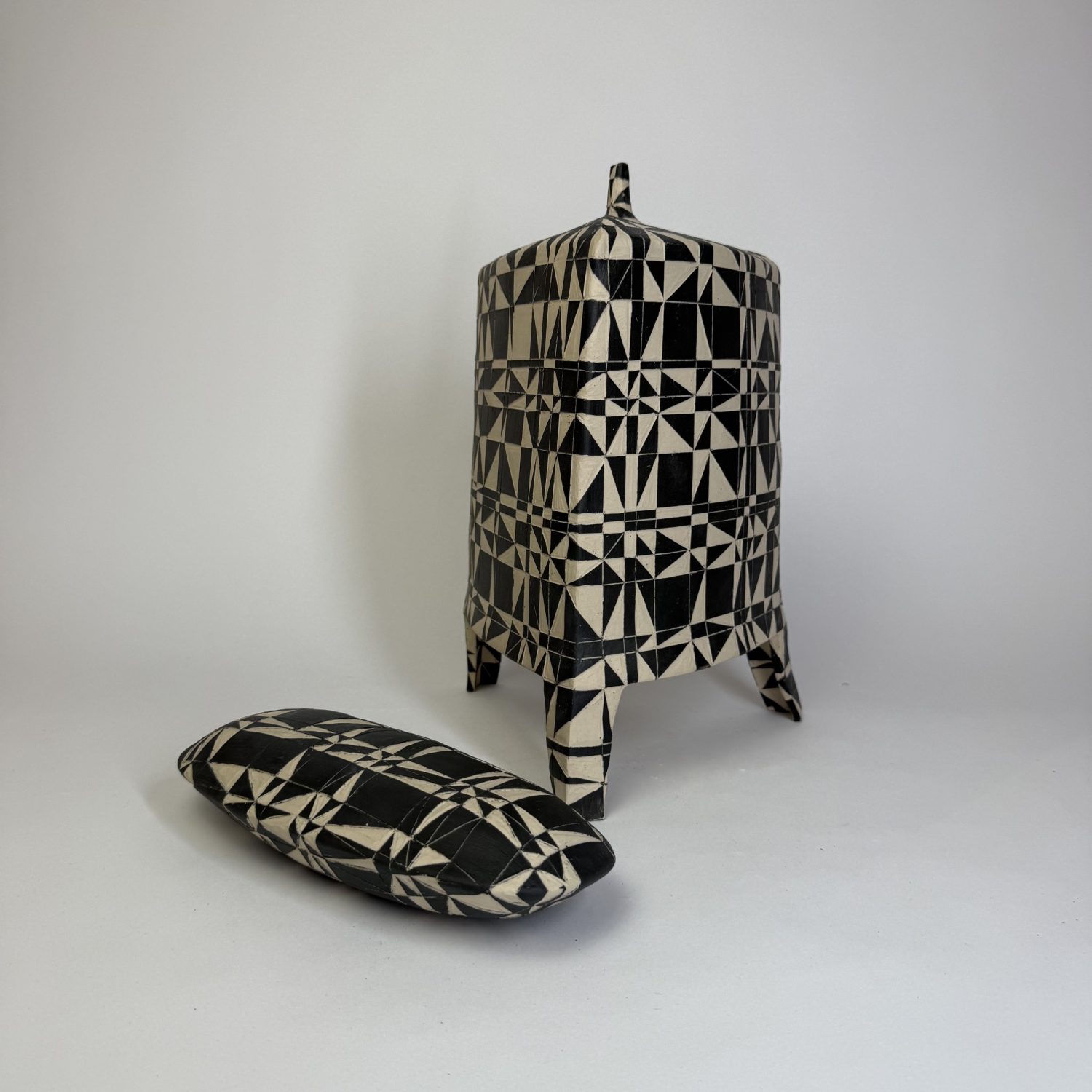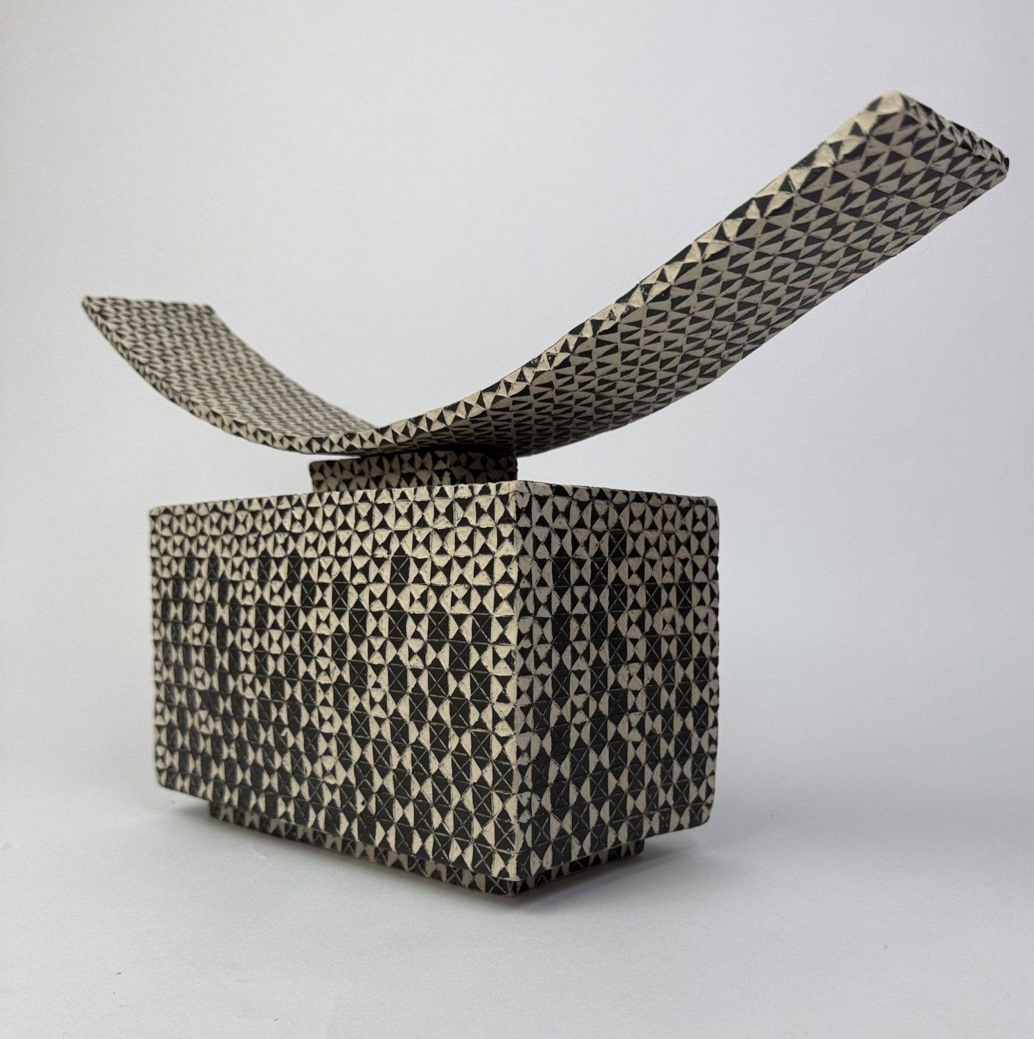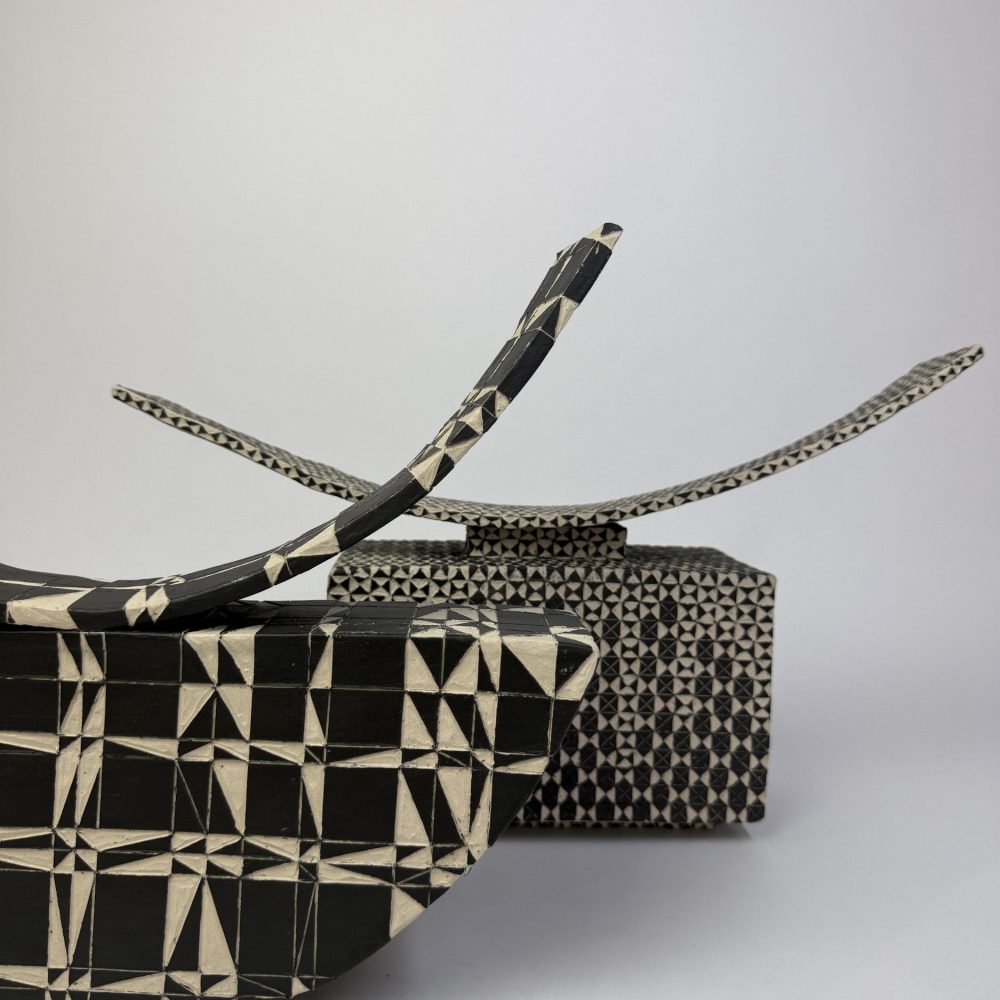 At the core is a conversation between three-dimensional form and two-dimensional pattern. Ambiguity is created by placing a rigid geometric pattern on sometimes an organic form, or vice versa, altering perception of the work.