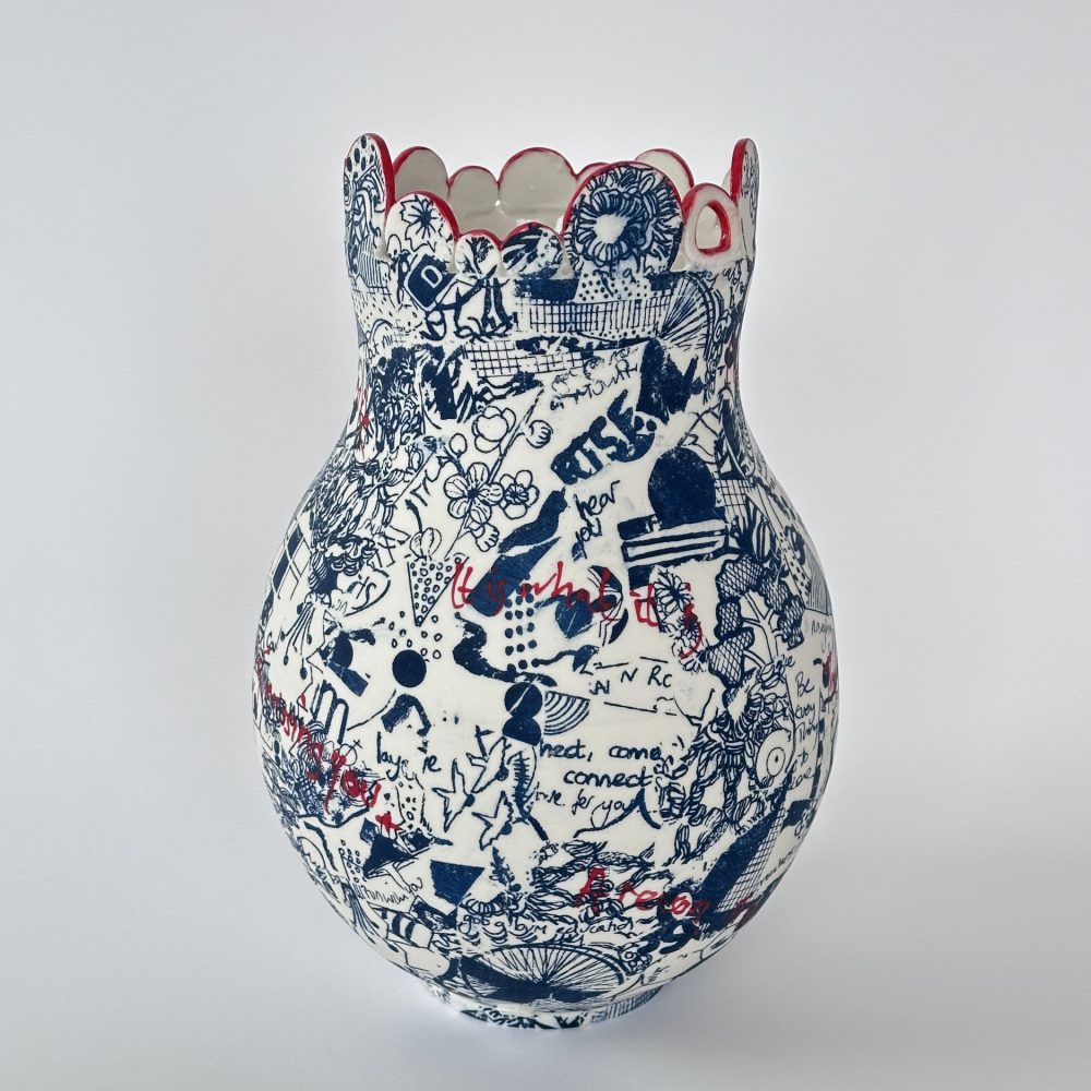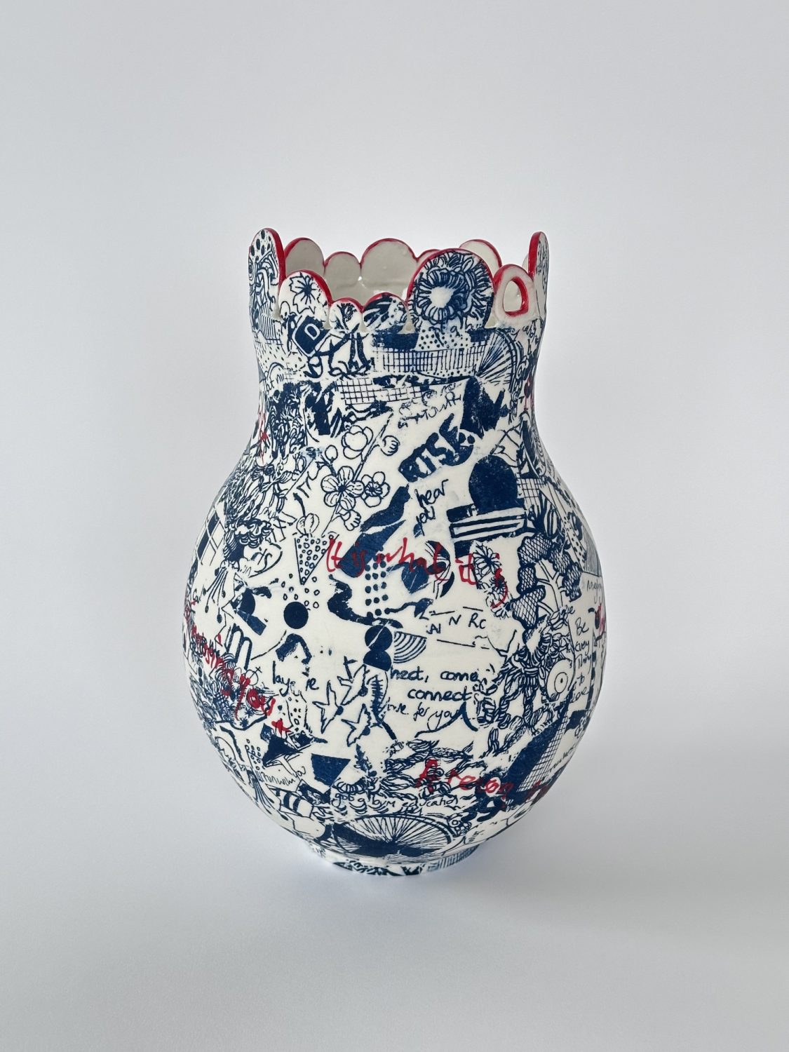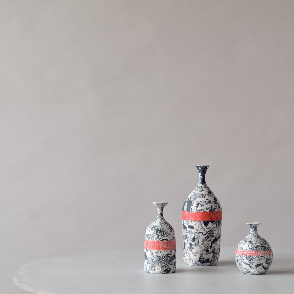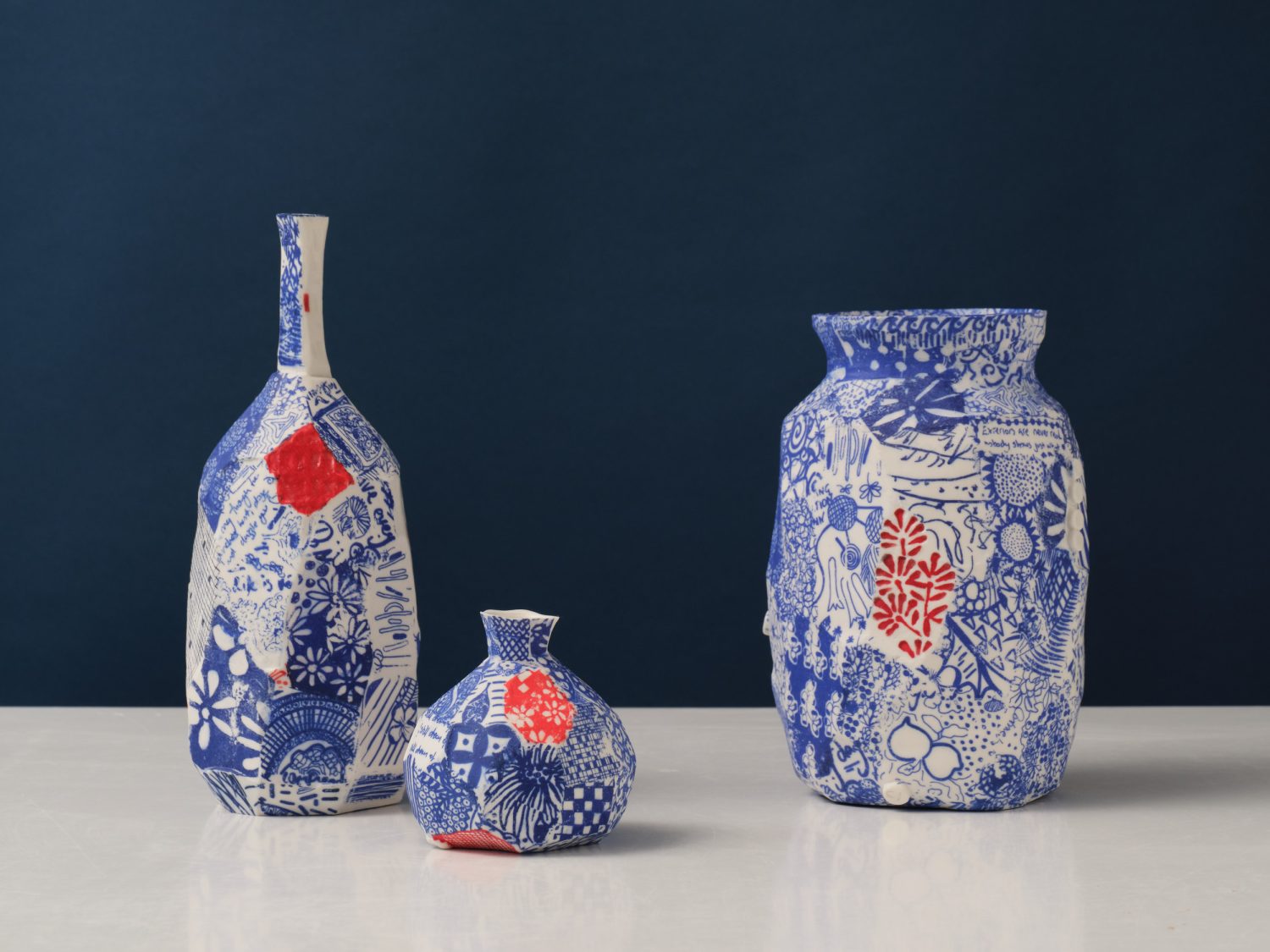 Her decorative process involves the collecting of personal stories, observational drawing and pattern. These are all recorded on paper then torn apart and rewoven onto each surface creating abstract meaning.