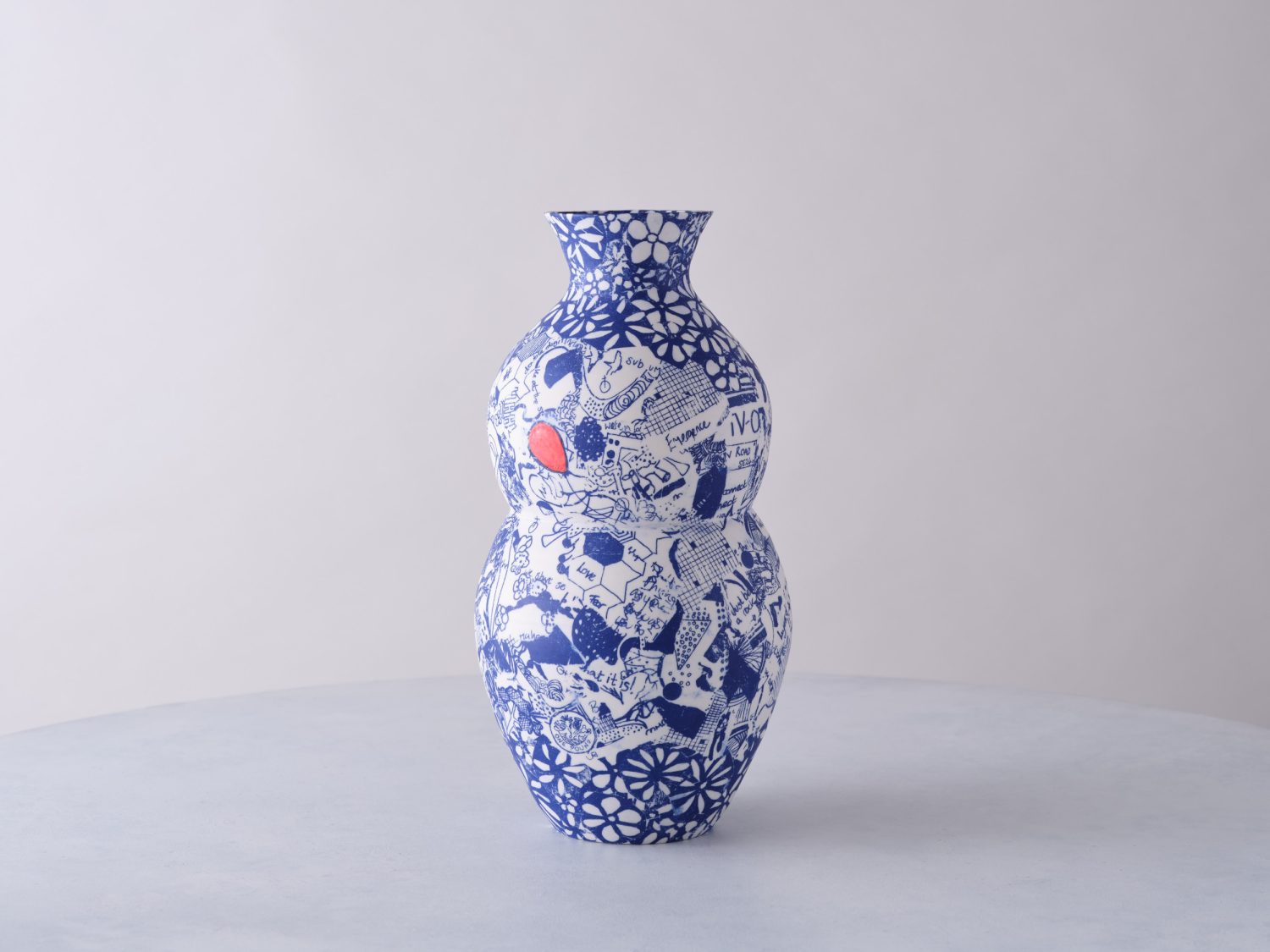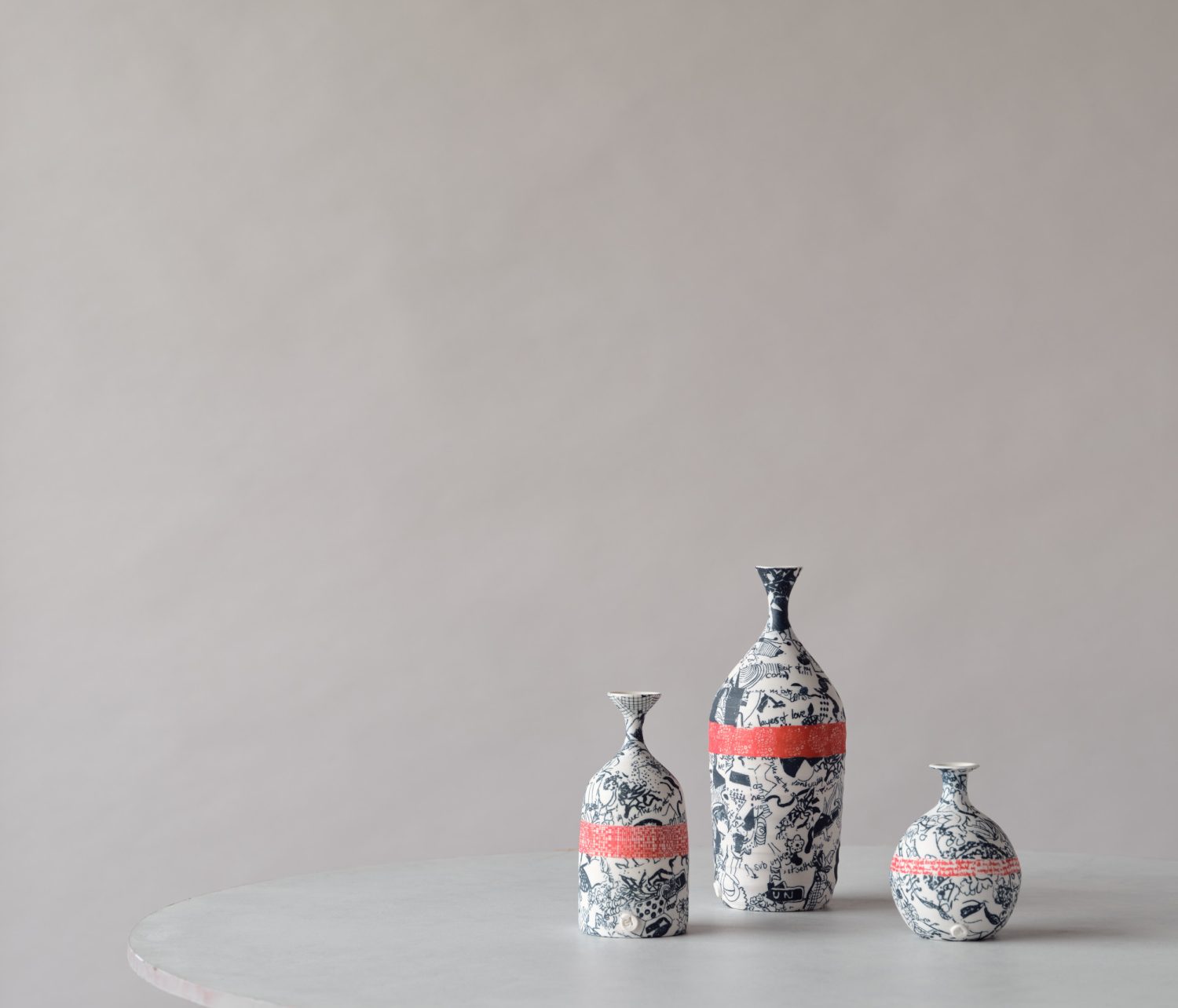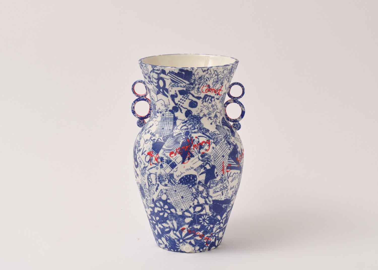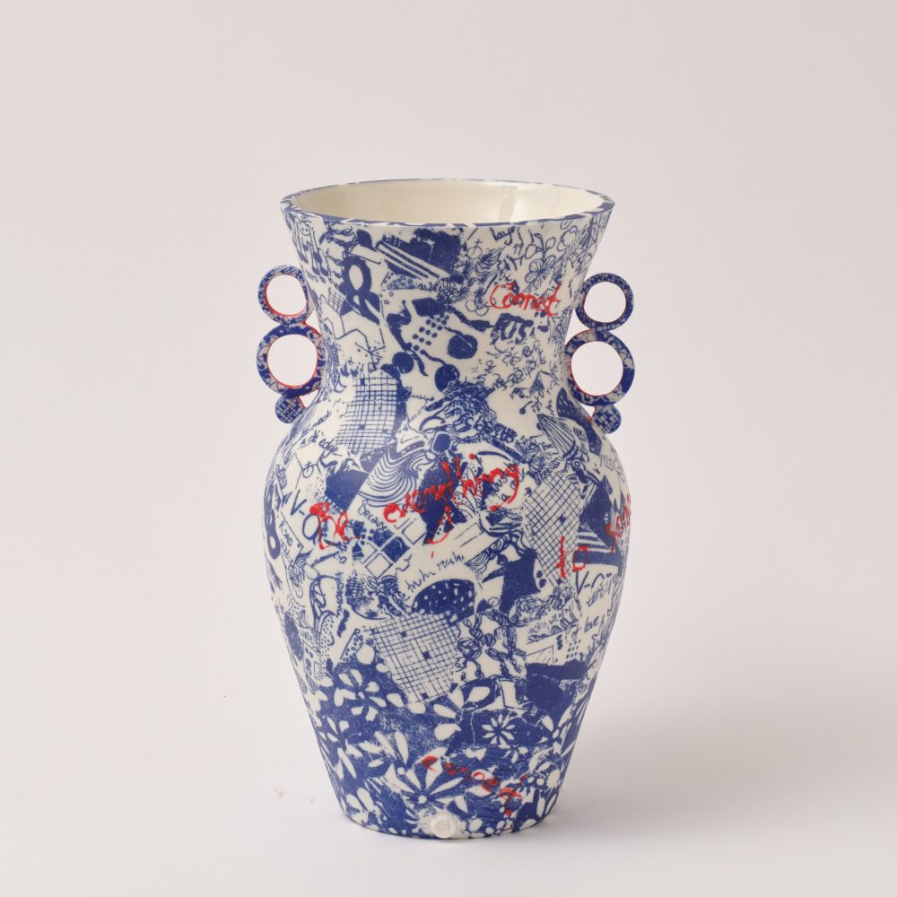 Her decorative process involves the collecting of personal stories, observational drawing and pattern. These are all recorded on paper then torn apart and rewoven onto each surface creating abstract meaning.