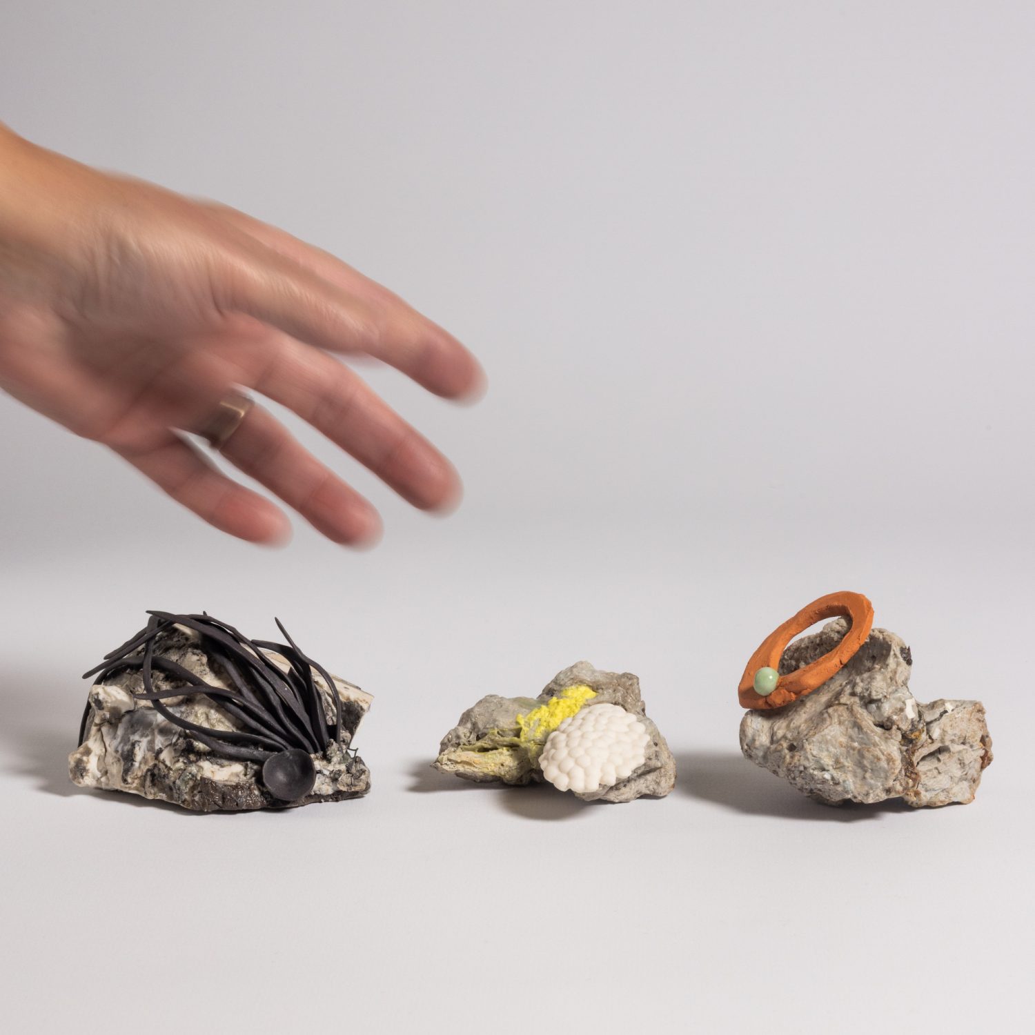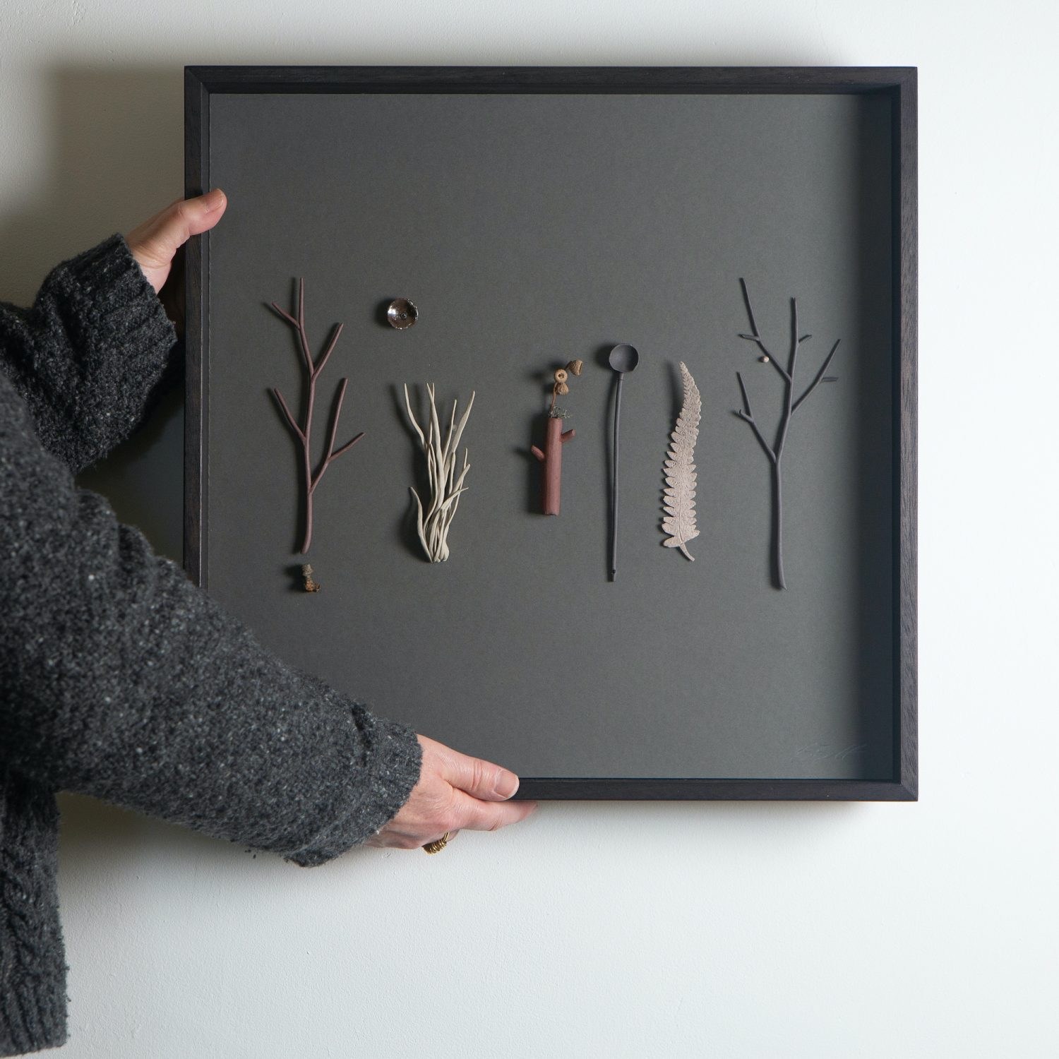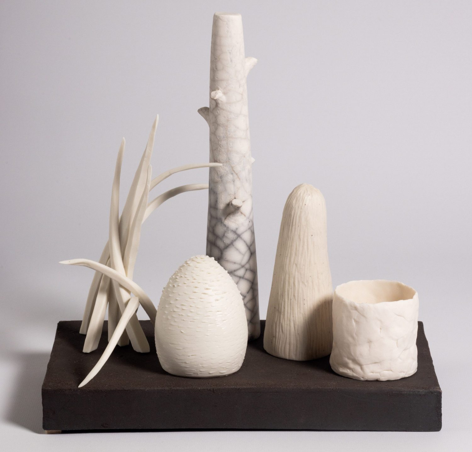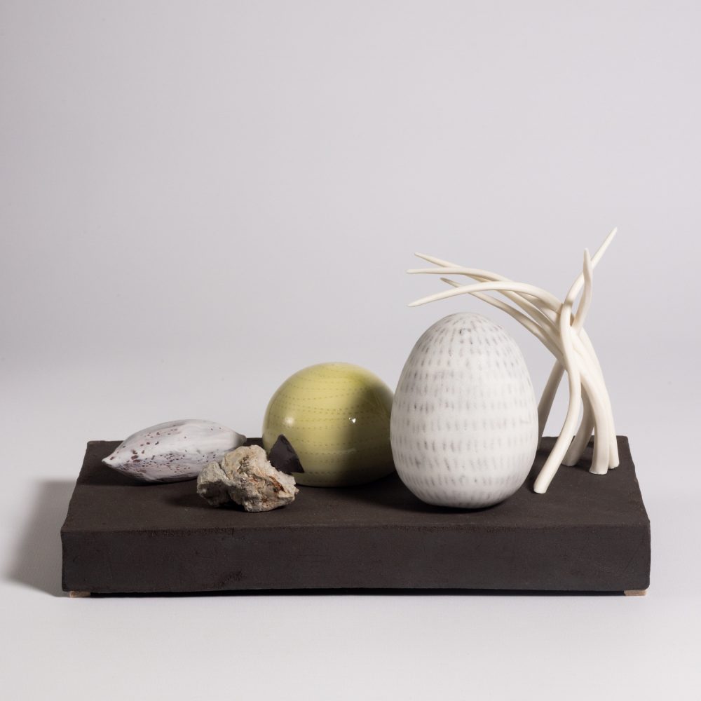 Elaine Sheppard-Bolt is a ceramic artist working in porcelain and stoneware to make sculptural forms and wall-pieces. Elaine uses techniques such as throwing and hand-building, colouring clays, layering slips and glazes and including found objects, to create collections and compositions that work together to suggest a story or explore an idea or memory. Elaine’s current work focuses on playful narrative pieces investigating the places where nature and human activity meet, and the ways in which they alter each other. The collections invite the viewer to connect with the work, bringing their own meanings or ideas to the forms.