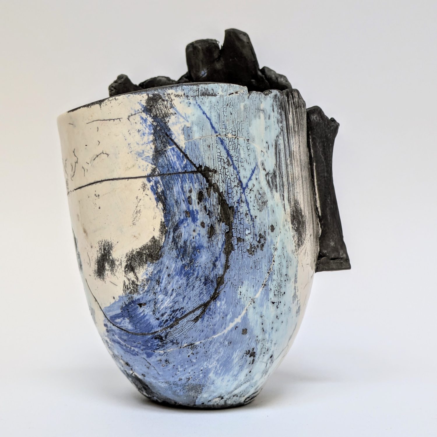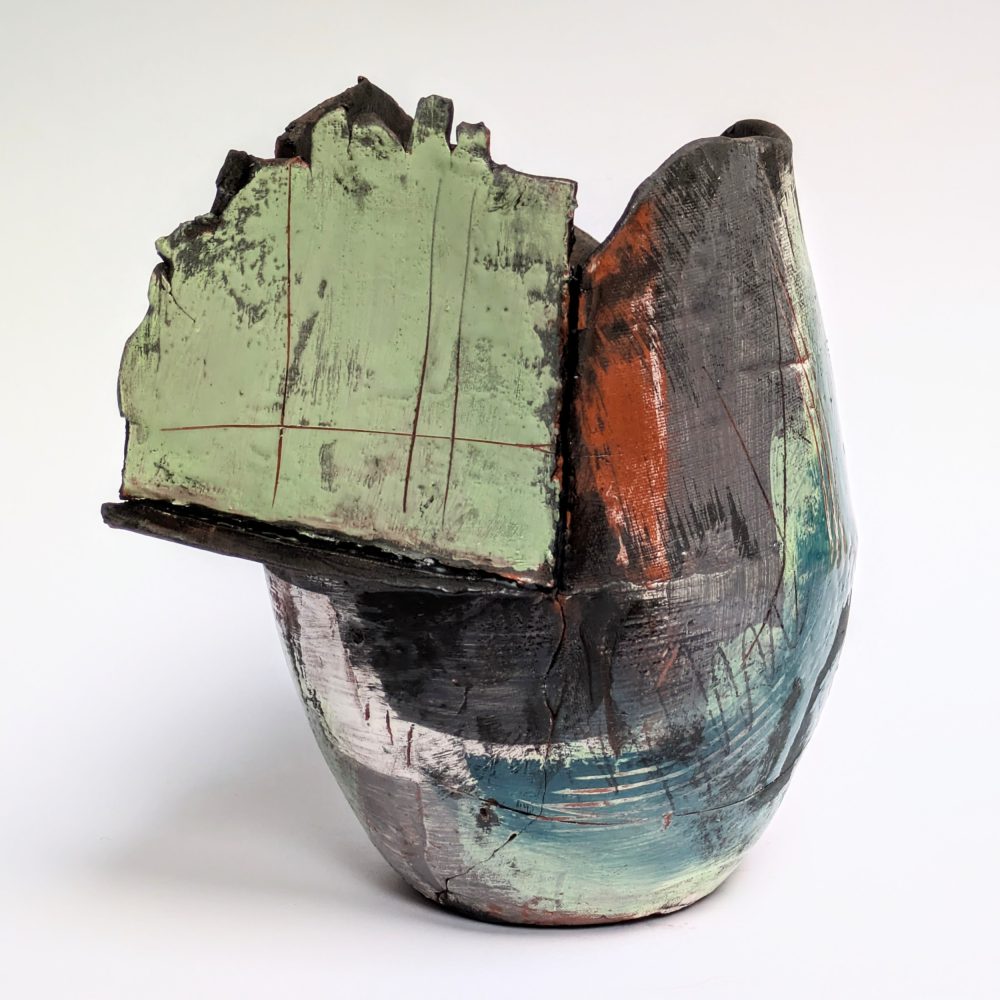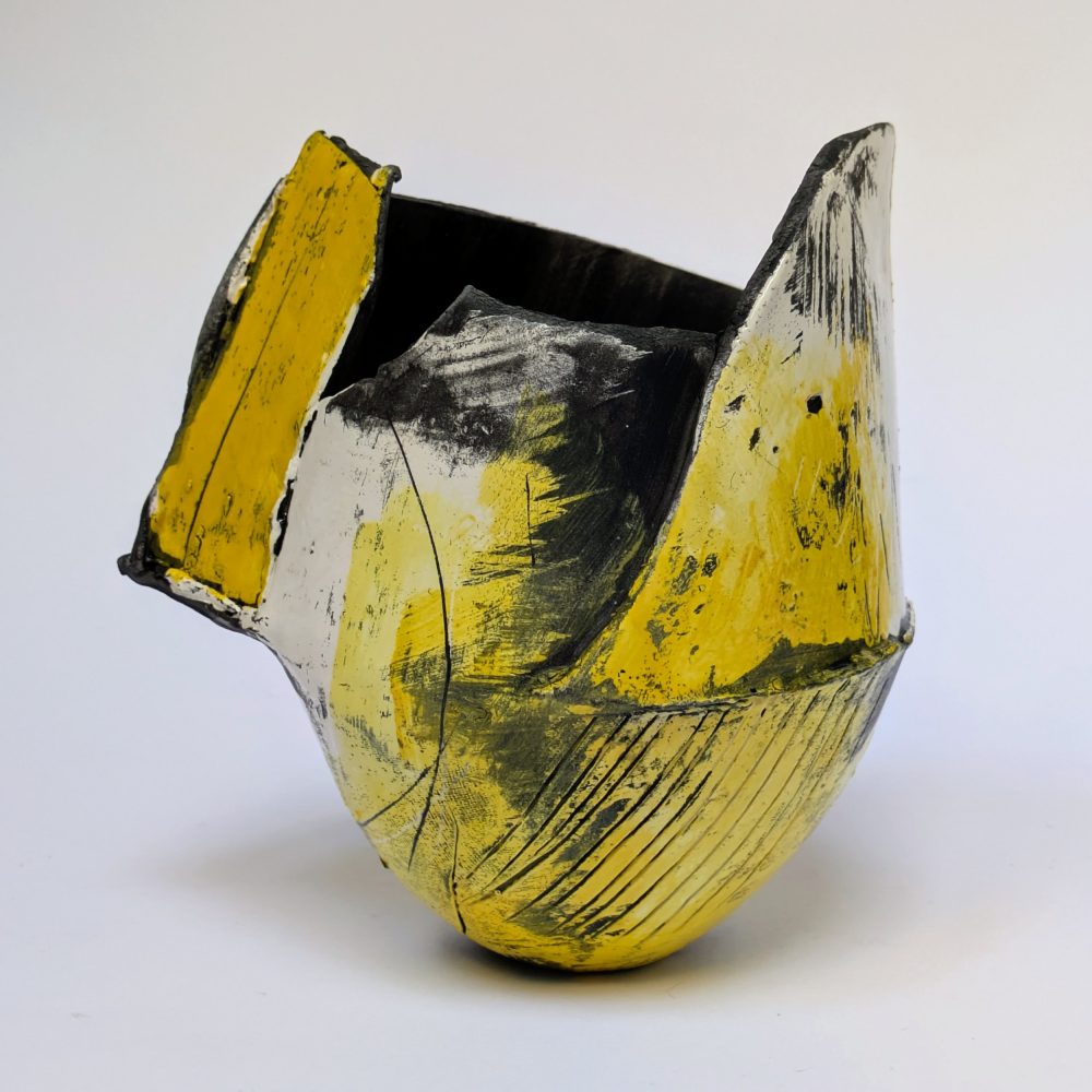 Through her work, Emily explores the dynamic relationship between colour, form, and texture. Expanding from her collaged two-dimensional works, she translates this visual language into three-dimensional vessels. By deconstructing and rebuilding clay forms, she introduces exaggerated overhangs, angles, and layered surfaces, collaging clay slabs to create fragmented structures. Each vessel is anchored in a single colour, with bold brushstrokes and intuitive mark-making guiding the viewer’s eye across shifting planes. Through the interplay of strong line, vivid colour, and gestural marks, her ceramics tell fleeting, abstracted stories.