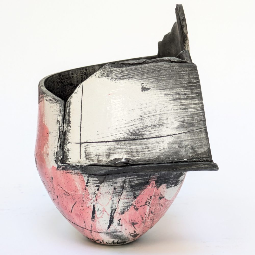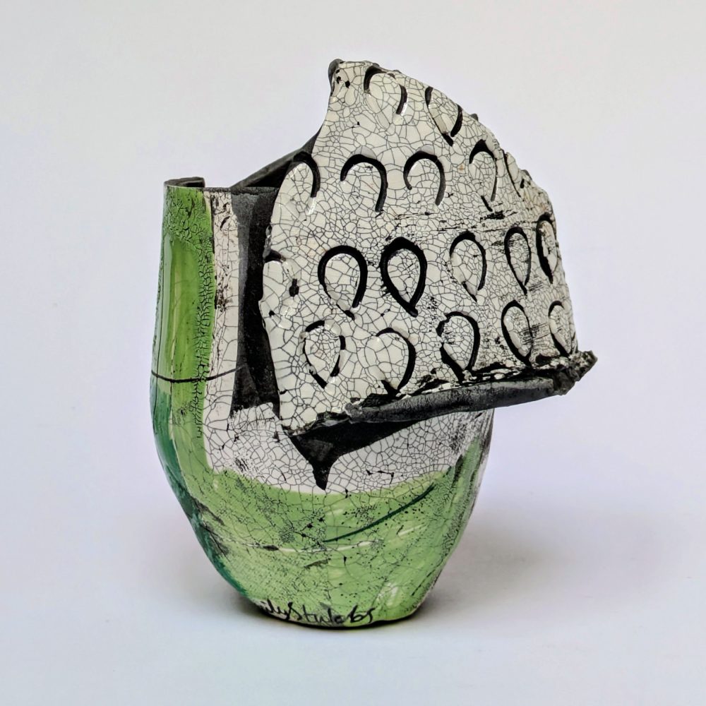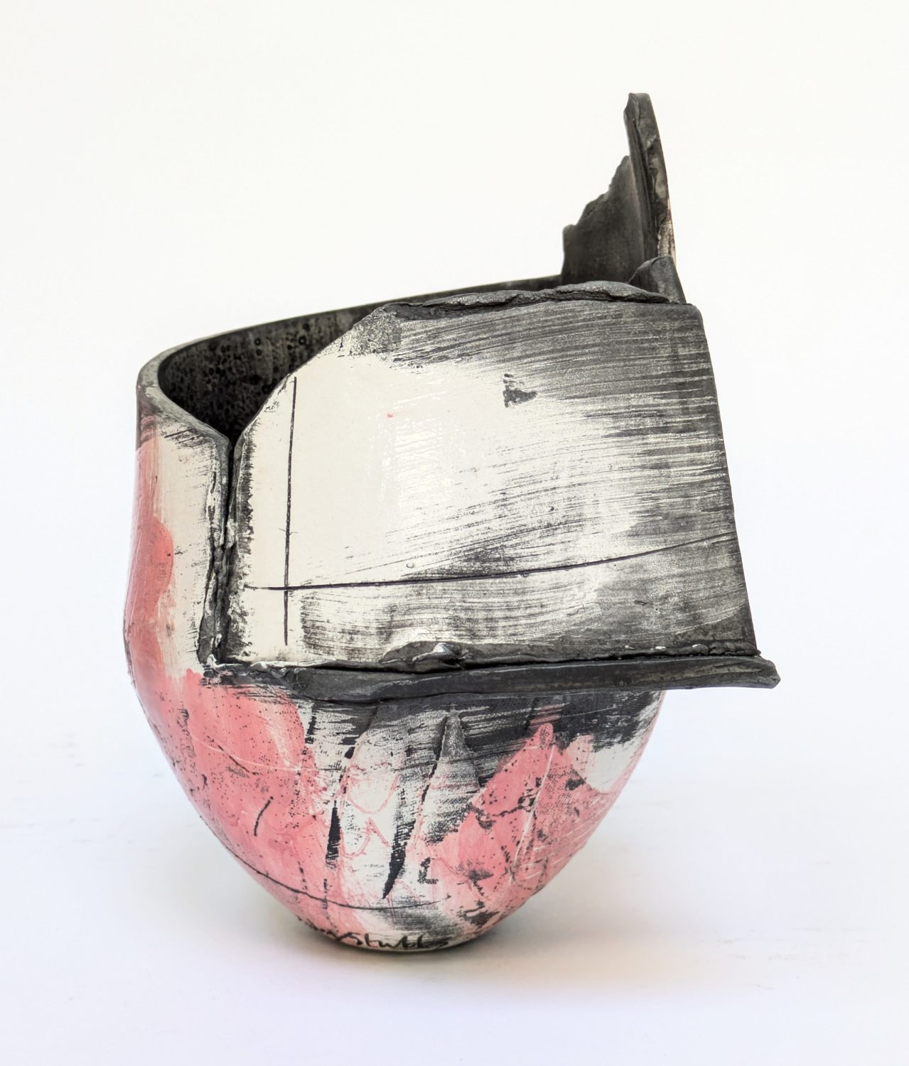 Through her work, Emily explores the dynamic relationship between colour, form, and texture. Expanding from her collaged two-dimensional works, she translates this visual language into three-dimensional vessels. By deconstructing and rebuilding clay forms, she introduces exaggerated overhangs, angles, and layered surfaces, collaging clay slabs to create fragmented structures. Each vessel is anchored in a single colour, with bold brushstrokes and intuitive mark-making guiding the viewer’s eye across shifting planes. Through the interplay of strong line, vivid colour, and gestural marks, her ceramics tell fleeting, abstracted stories.