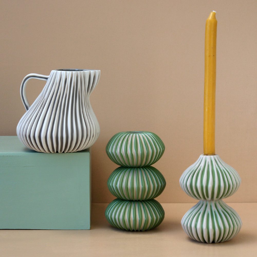 With a background in mould making for cast glass at Falmouth University, Harriet works in a modular way, casting multiples, altering and joining them together through line.