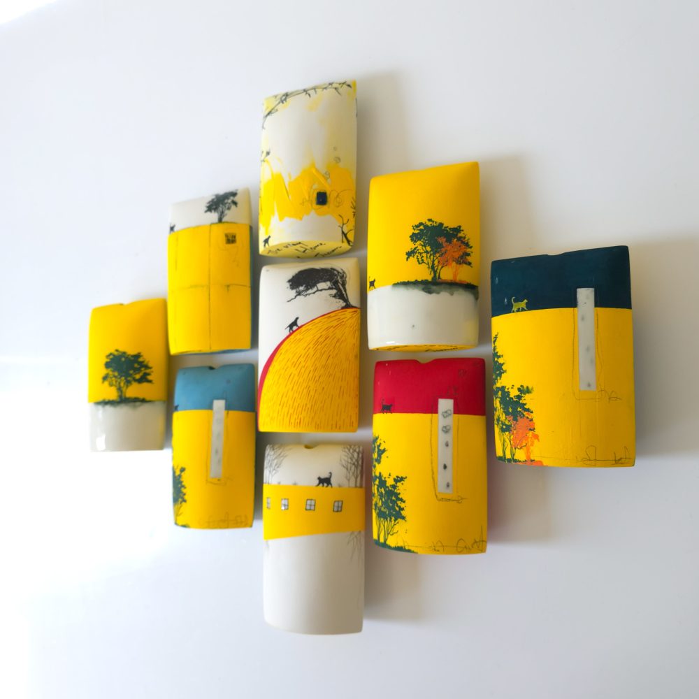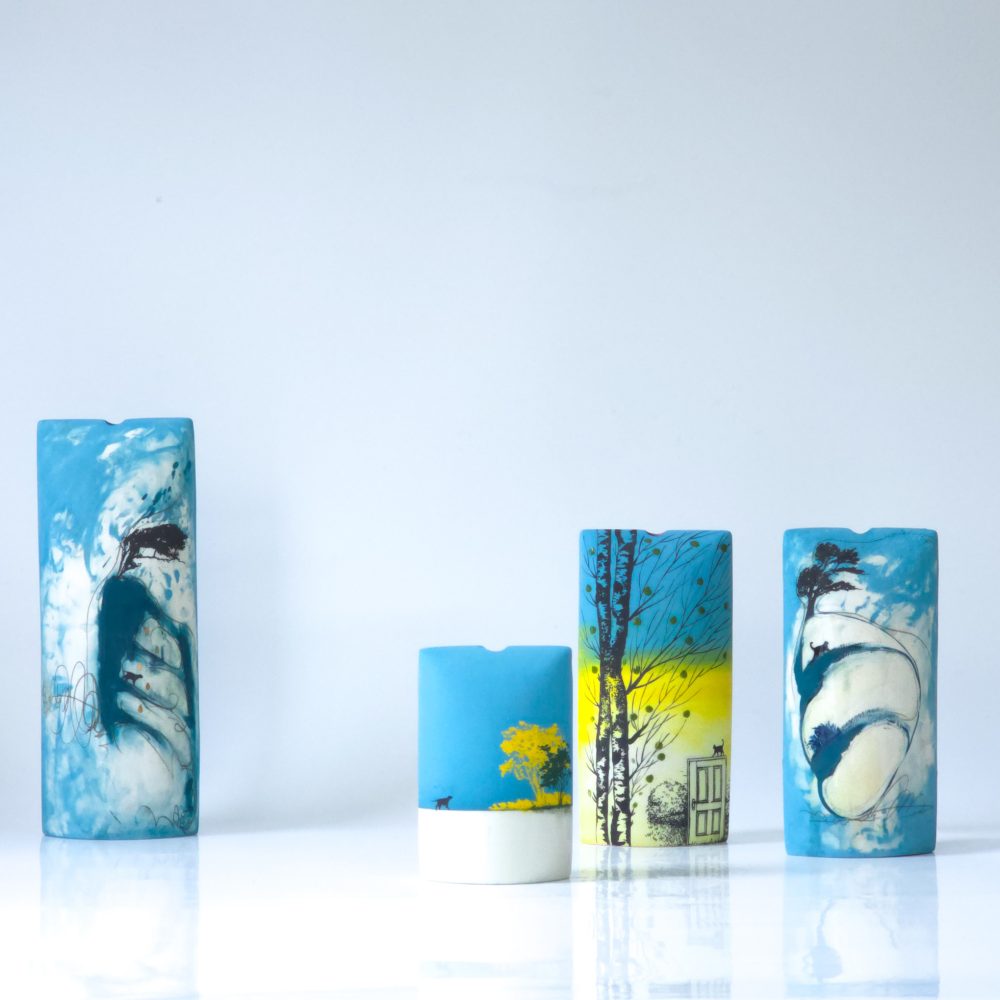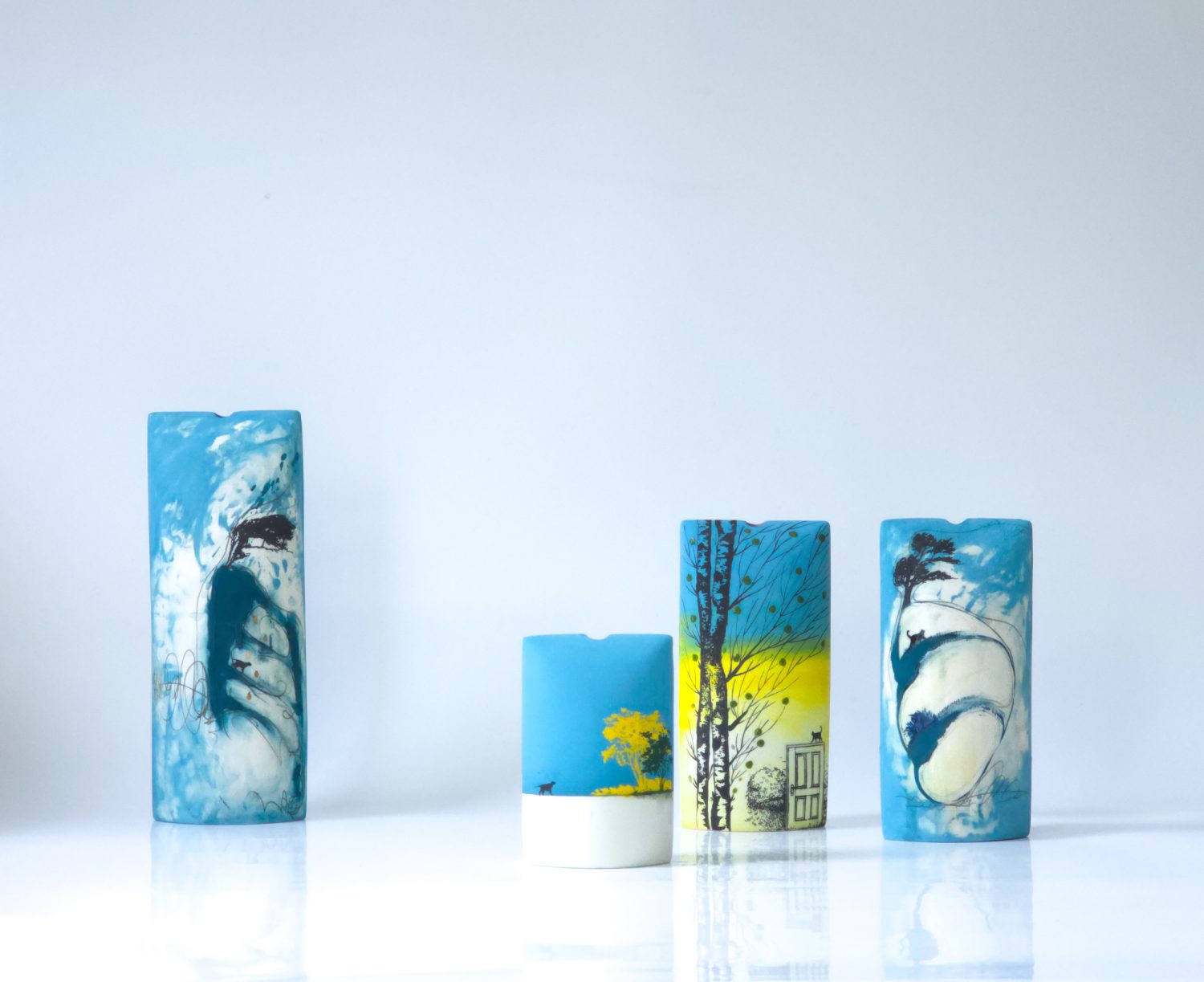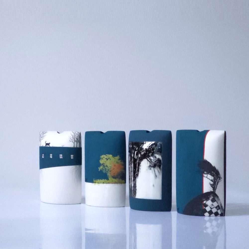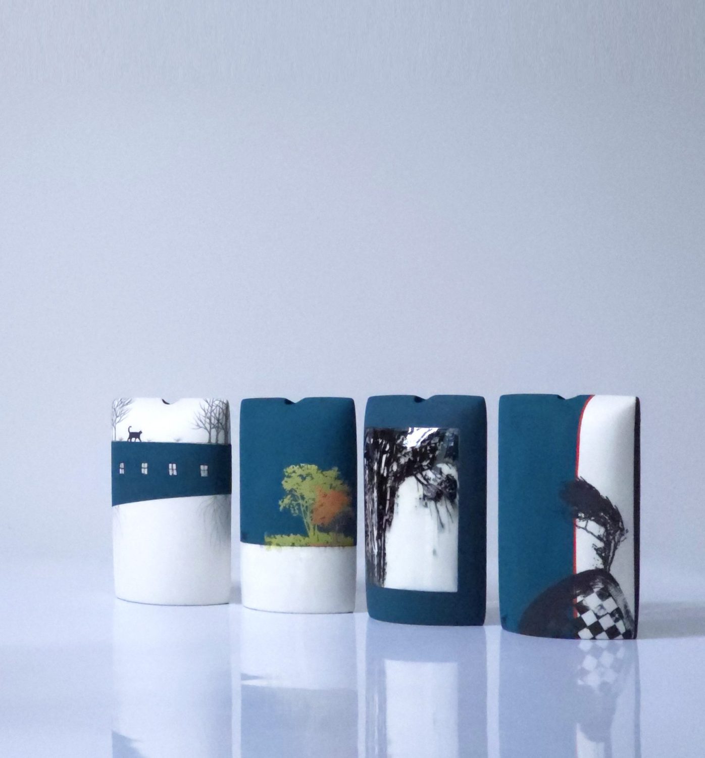 Jaeeun Kim creates distinctive slip-cast ceramics that merge functional form with painterly surface decoration. Influenced by her studies in Korea, she often begins by recalling her way back home from school, capturing skies, trees, and shifting scenery. These memories become abstract expressions layered in underglaze, blending colour and gesture. Her work also draws on art therapy concepts, with recurring motifs of houses, trees, and people reflecting inner states. Each piece balances thoughtful design with expressive surfaces, inviting reflection on memory, place, and the emotional landscape of everyday life.