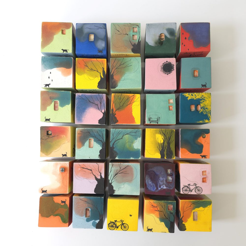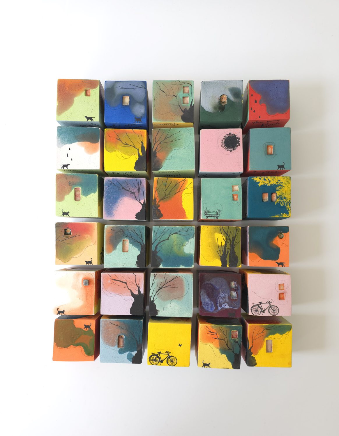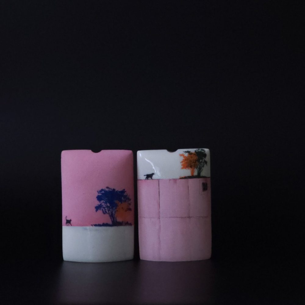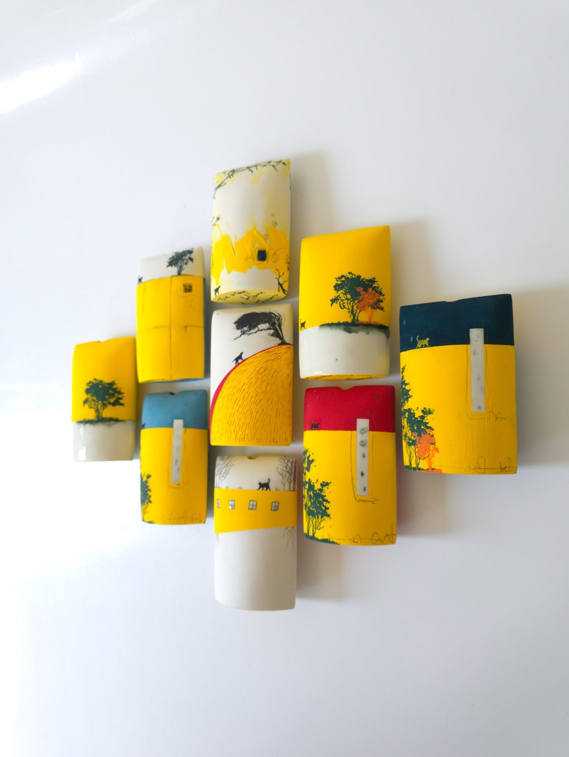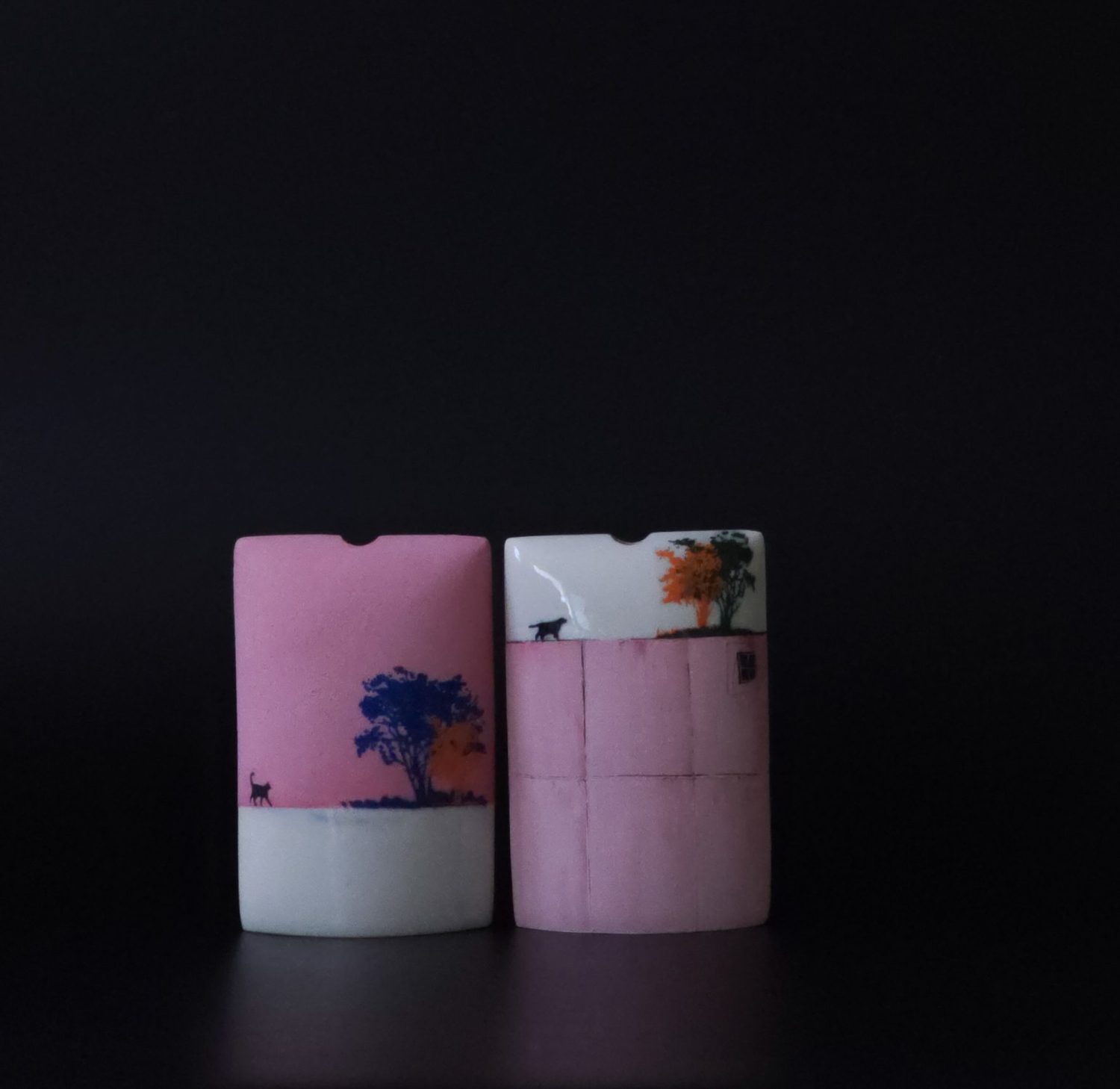 Jaeeun Kim creates distinctive slip-cast ceramics that merge functional form with painterly surface decoration. Influenced by her studies in Korea, she often begins by recalling her way back home from school, capturing skies, trees, and shifting scenery. These memories become abstract expressions layered in underglaze, blending colour and gesture. Her work also draws on art therapy concepts, with recurring motifs of houses, trees, and people reflecting inner states. Each piece balances thoughtful design with expressive surfaces, inviting reflection on memory, place, and the emotional landscape of everyday life.