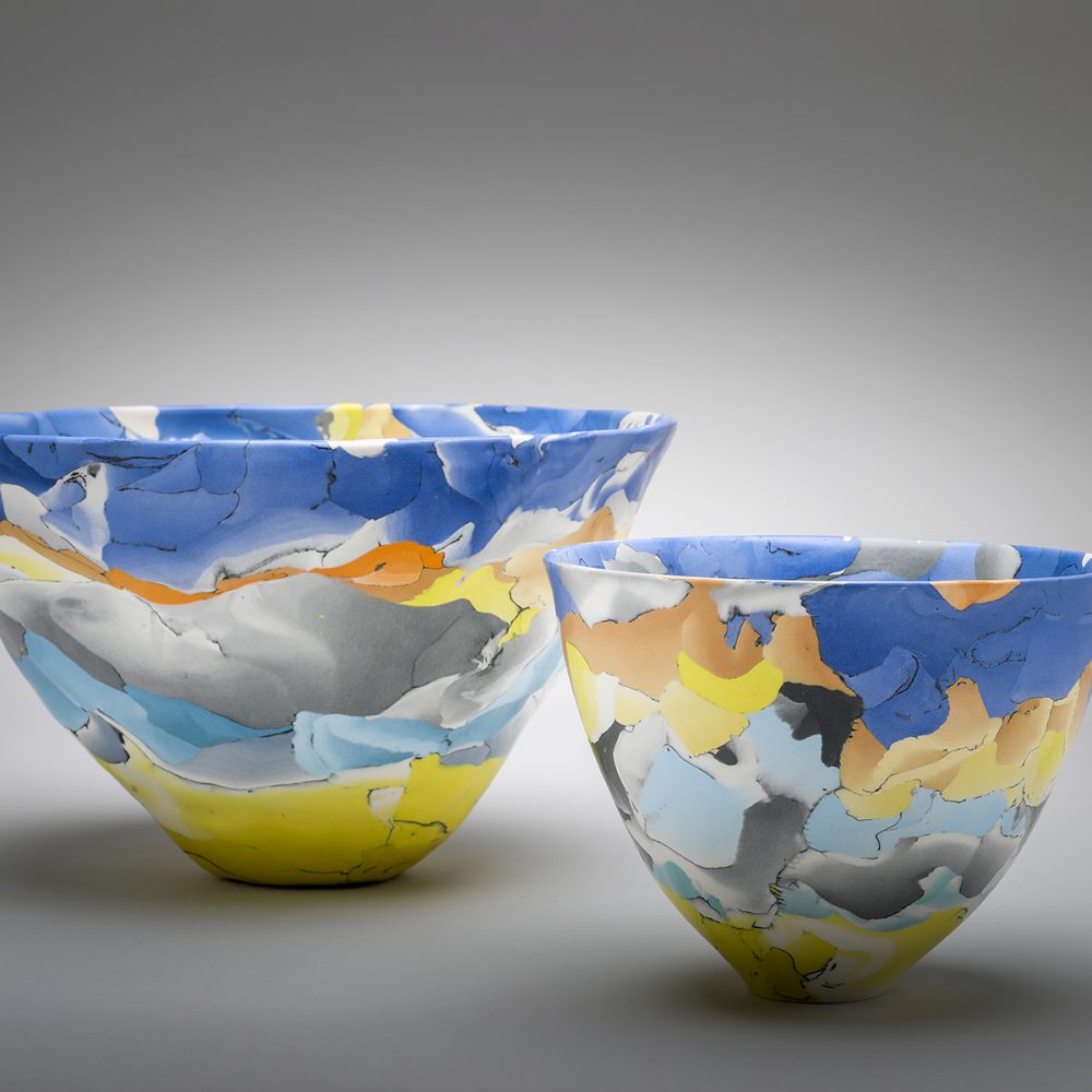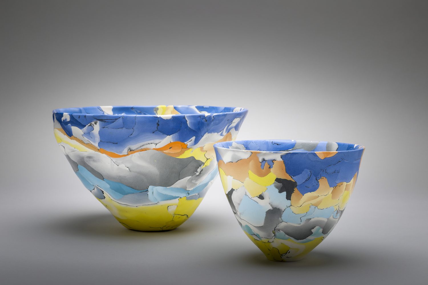 Passionate about clay’s magical properties of malleability, Nerikomi embraces everything she loves most about ceramics. From colouring the porcelain with stains and oxides, to forming patterns and creating designs. A dialogue ensues between maker and material. A design can be imposed, but the clay will distort and twist, giving rise to its own voice, creating unique patterns. Nerikomi is an ancient process but one which lends itself beautifully to reinvention. She finds the endless possibilities for creating new patterns, colour combinations and forms extremely captivating.