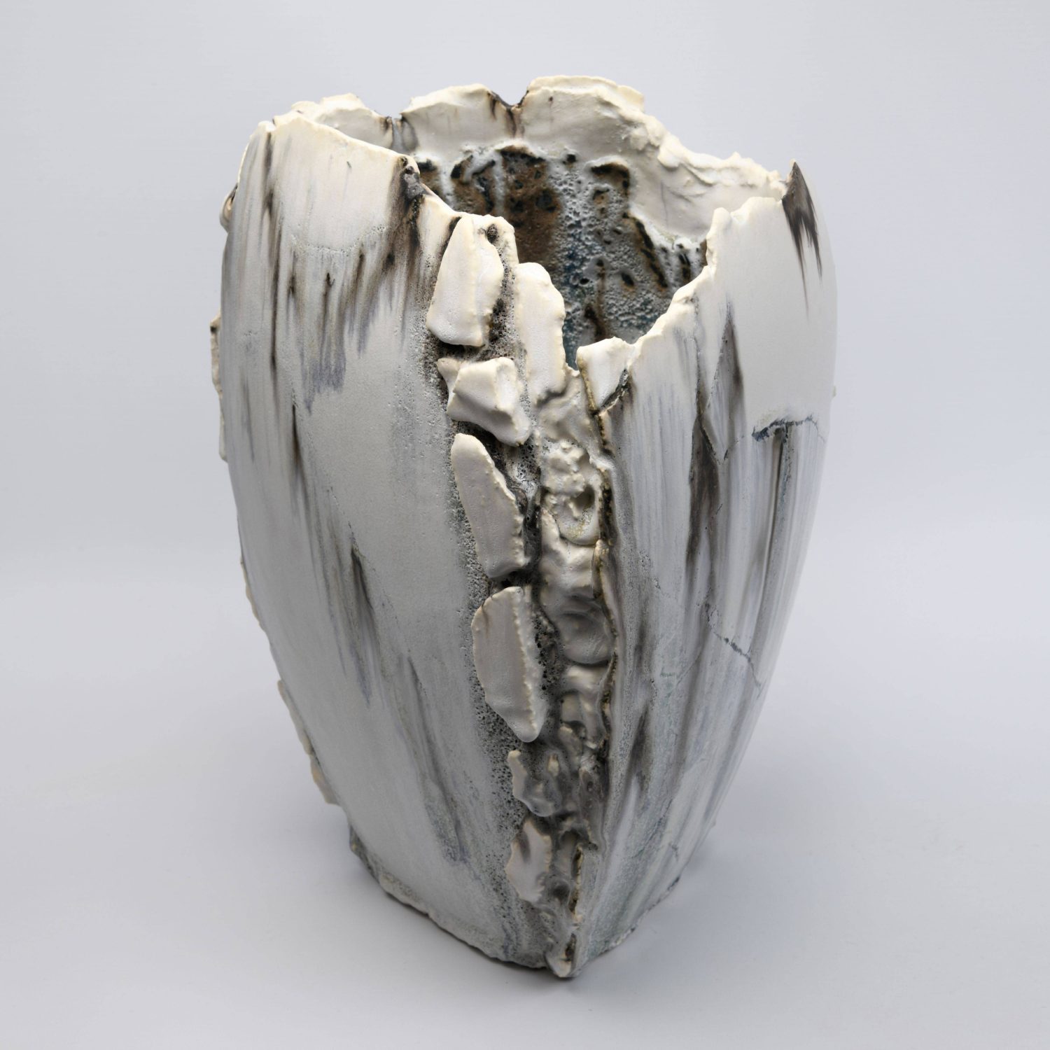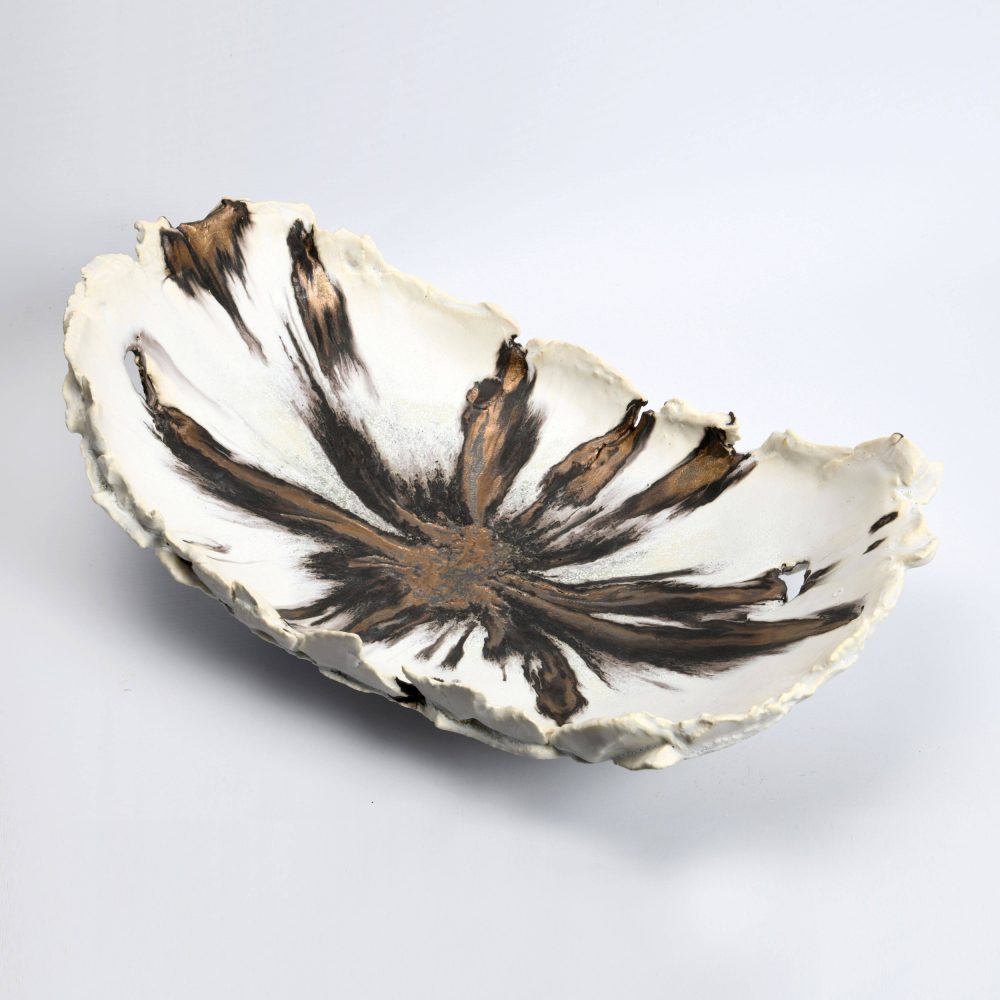 Inspired by geological formation, erosion and the transformational nature of time, she searches for the most intriguing sense of balance and contrast, strength and fragility. Using fragments of broken clay slabs to create hand-built, sculptural vessels with undulating edges, fault-lines and fissures.