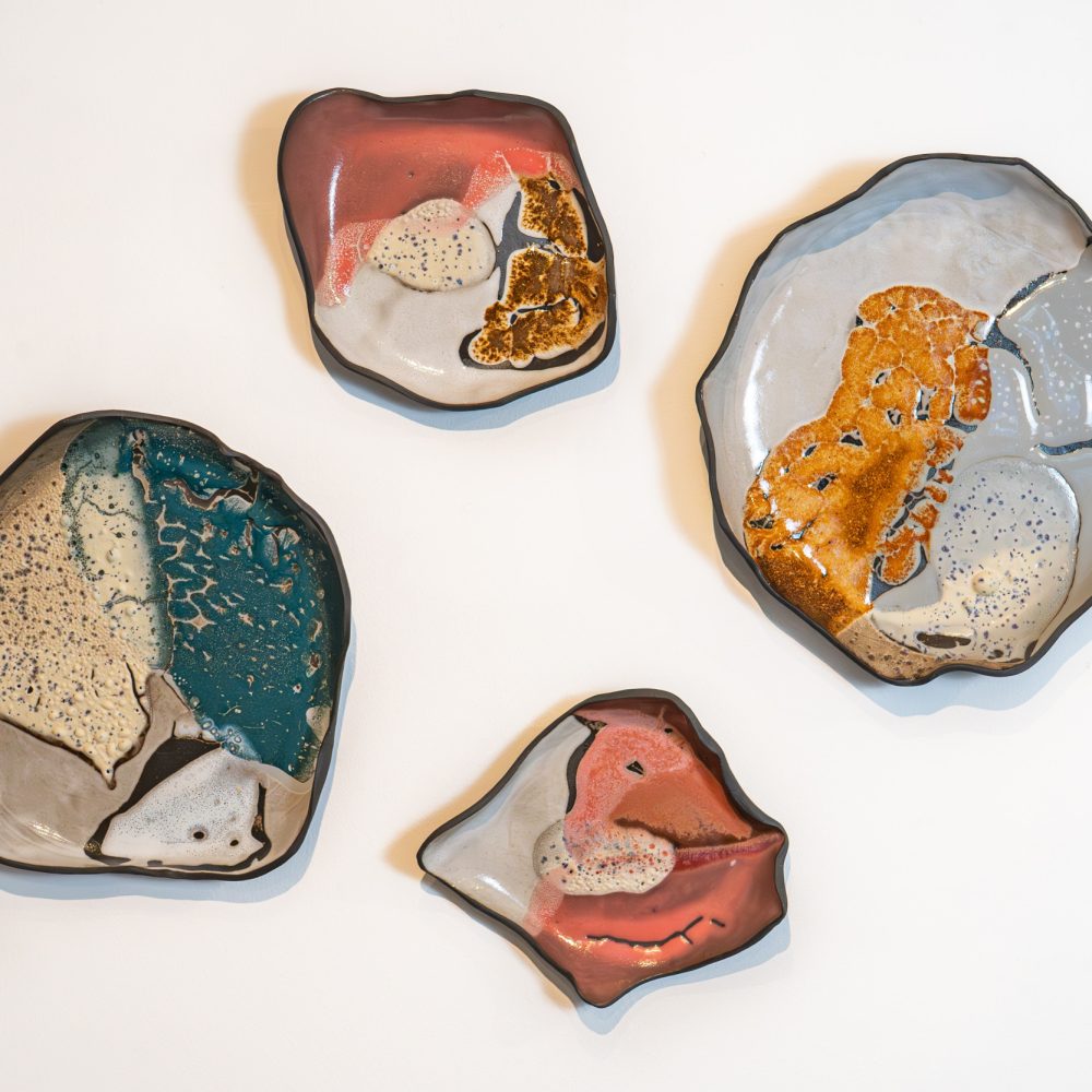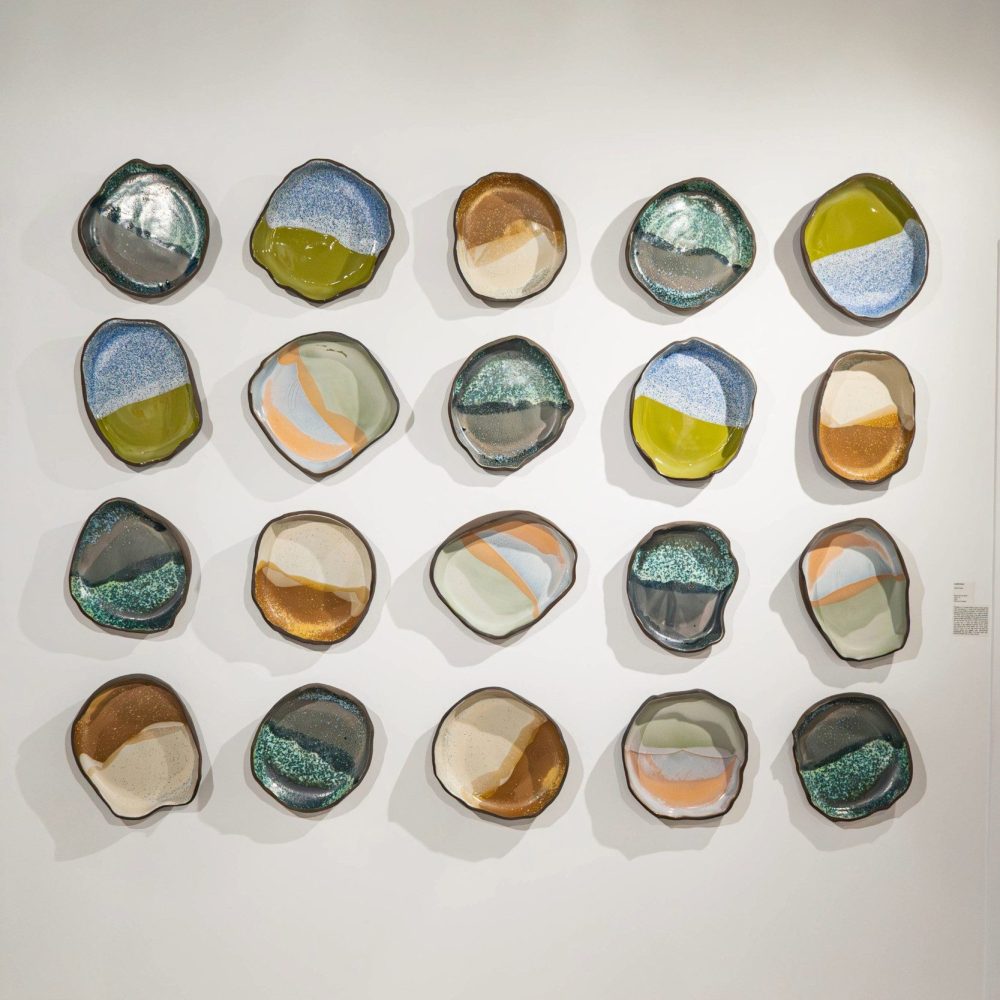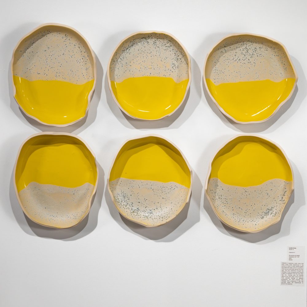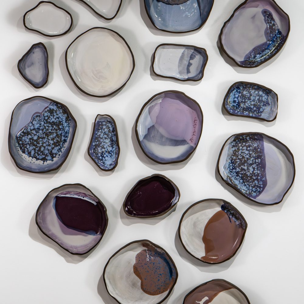 Experimenting with glaze quality, Landis recreates portions of her colour visions on clay wall installations. She intricately layers glazes to achieve colour and light variations. Lighter glazes pierce darker ones, reaching the vessel’s surface, where ambient light further draws attention. Her explorations have led her to investigate new ceramic forms and presentations.