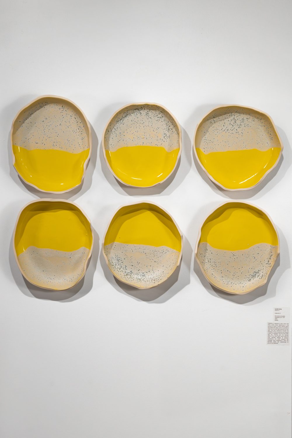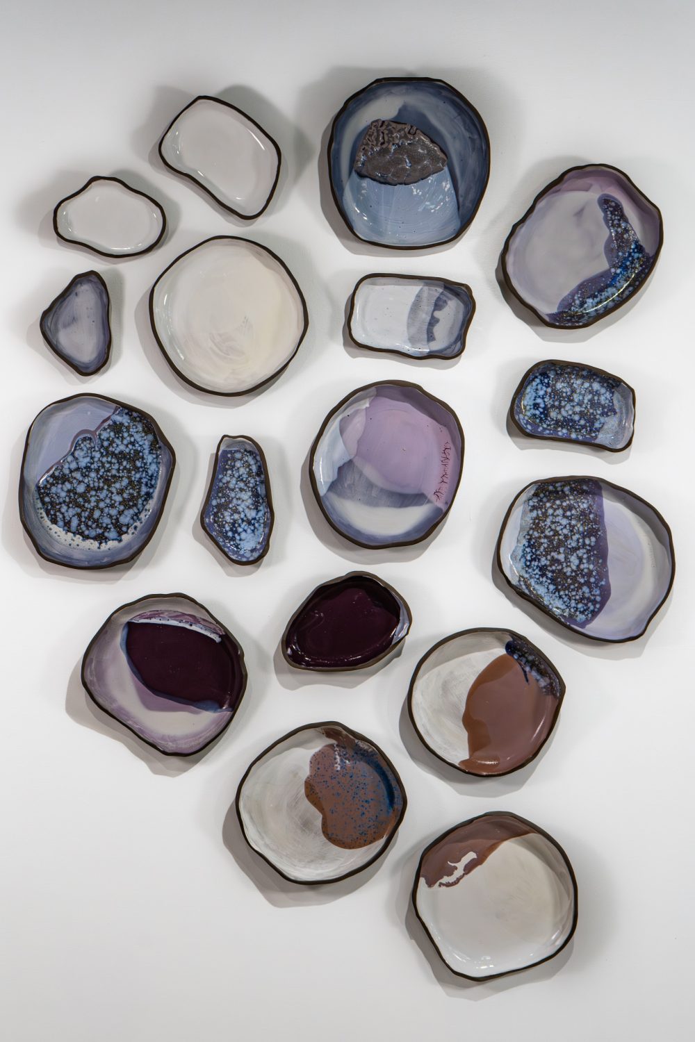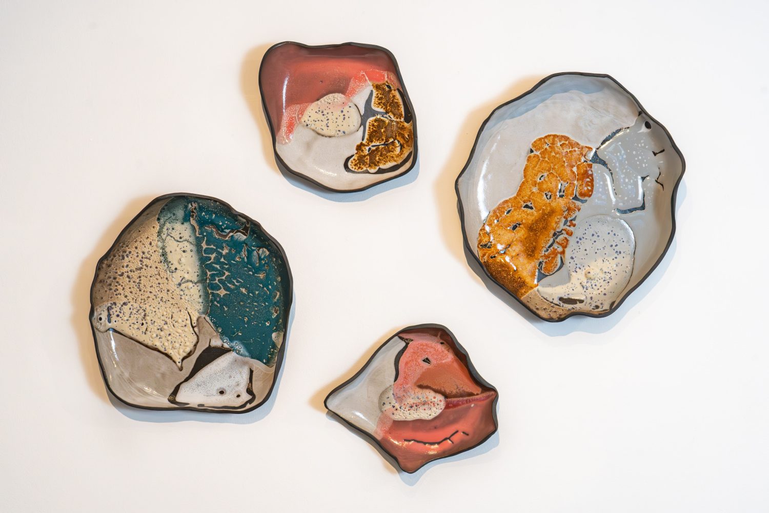 Experimenting with glaze quality, Landis recreates portions of her colour visions on clay wall installations. She intricately layers glazes to achieve colour and light variations. Lighter glazes pierce darker ones, reaching the vessel’s surface, where ambient light further draws attention. Her explorations have led her to investigate new ceramic forms and presentations.
