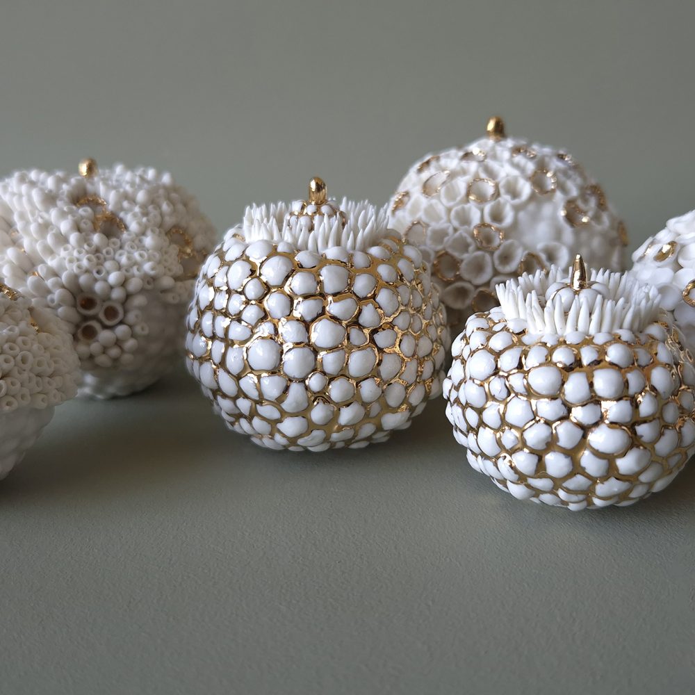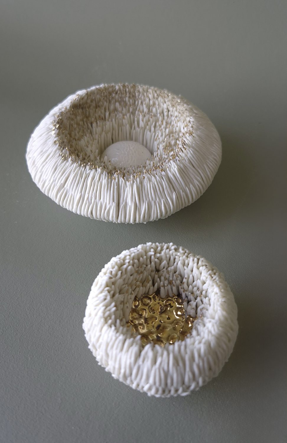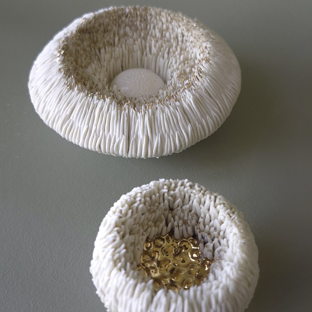 Lisa Biris creates sculptural objects out of porcelain and stoneware which are inspired by the beauty and diversity of nature. All objects are based on three principles: texture, contrast and movement. Her process of creation is organic and seldom pre-planned, this instills the pieces with a natural organic feeling as if a piece might have naturally grown into the end result instead of being manmade. Each object takes many hours to create, every little element of texture is made and added individually. The glaze, oxides and lusters are also applied separately with a (small) brush on the object.