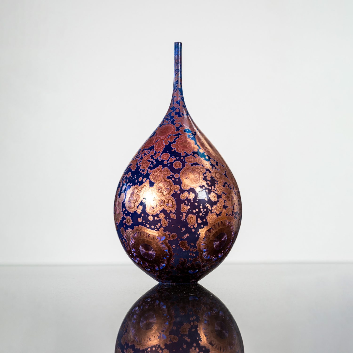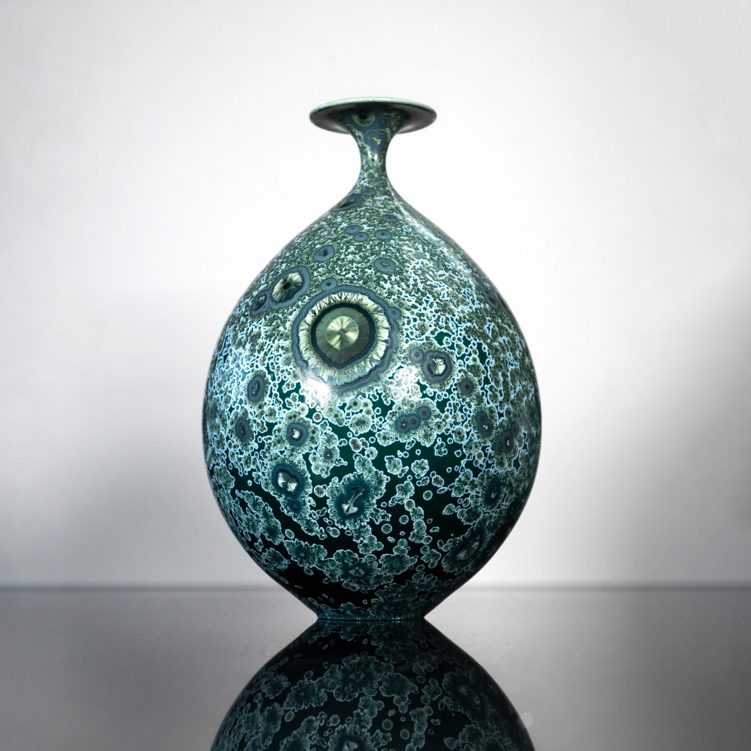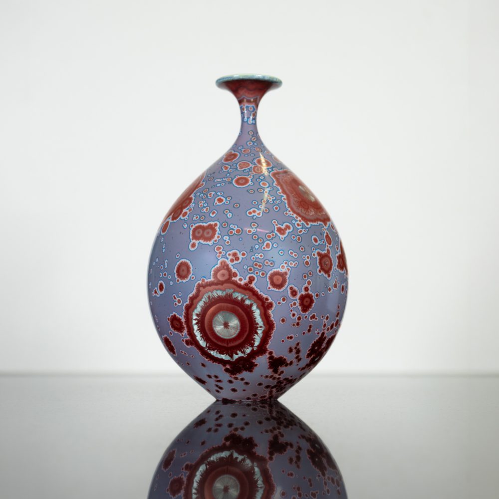 Matt enjoys pushing the boundaries of form with contemporary, elegant and sometimes challenging shapes, which are complemented by the stunning colour combinations in his glazes. All of his work is hand thrown in porcelain on the potter’s wheel and finished with crystalline glaze. Crystalline is a complex glazing process in which zinc silicate crystals form in the glaze during the firing, making every piece completely unique.
