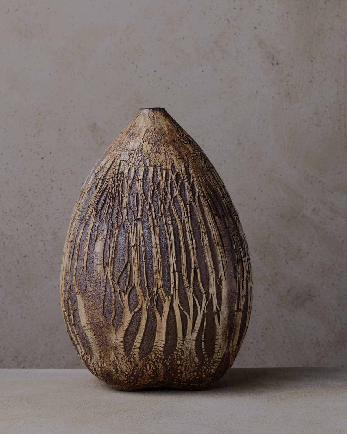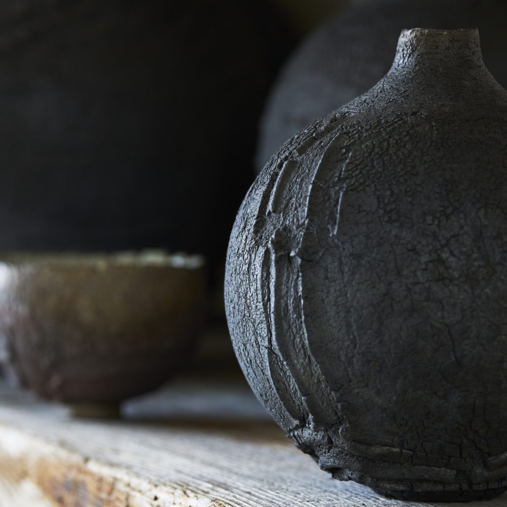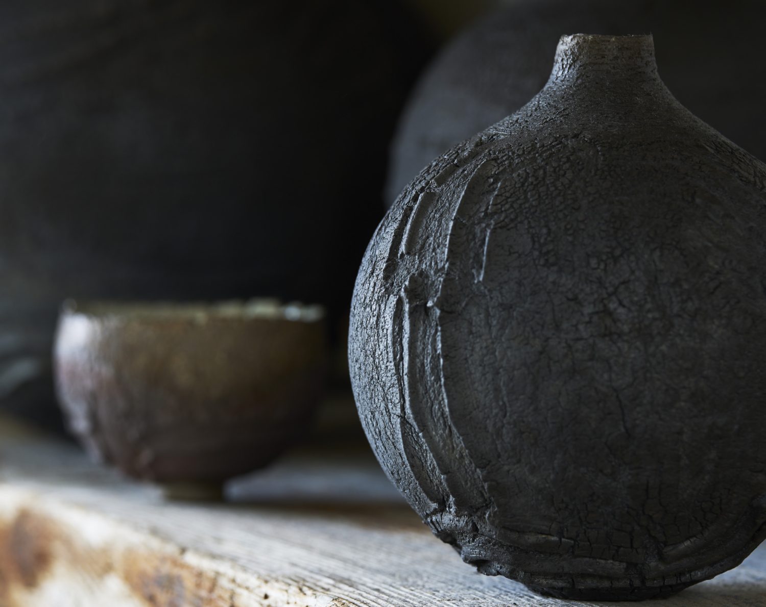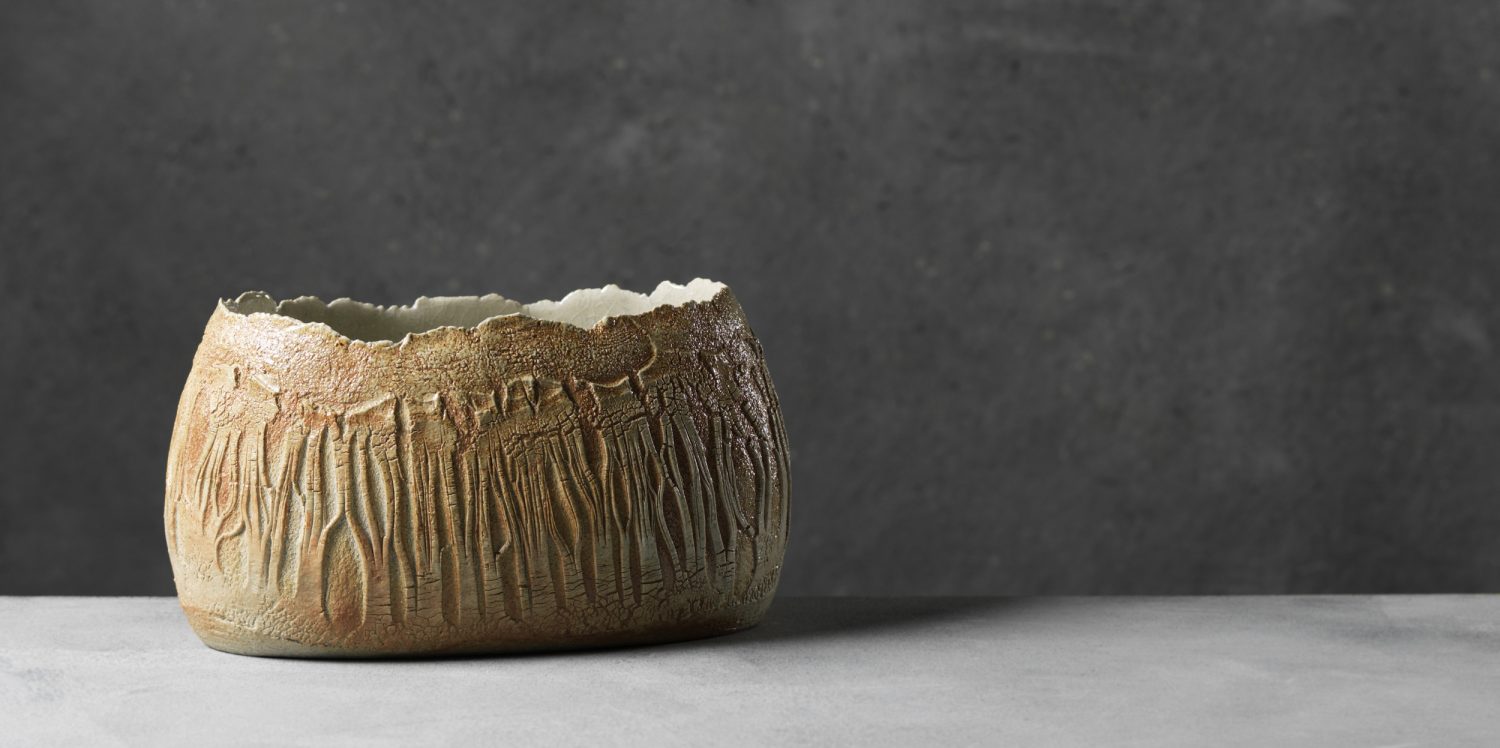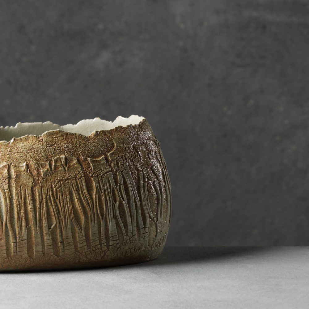Patricia Shone’s work is hand formed by texturing and stretching from solid pieces of clay. Texture, and how a piece feels in the hand is primary; clay as a physical connection with the world, a visceral process trying to reveal the inexpressible. The mineral nature of the material reflects the formation and weathering of land and the passage of humans across the surface. She aims for tension and balance between the container and its contents. Grounded by the controlled forms of functional vessels but liberated from those constraints by broken, textured surfaces.