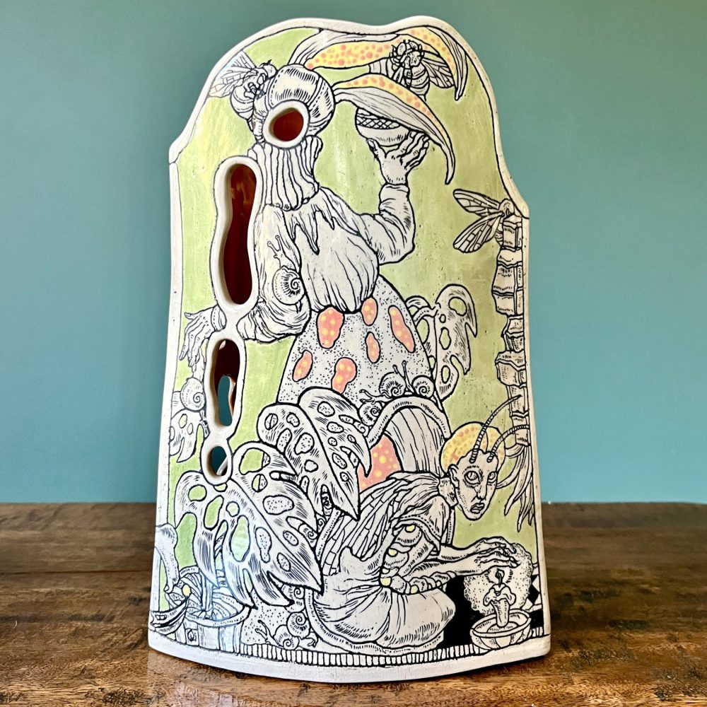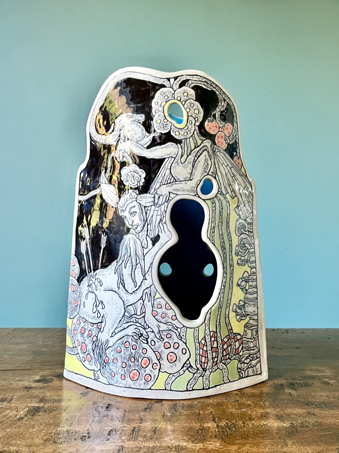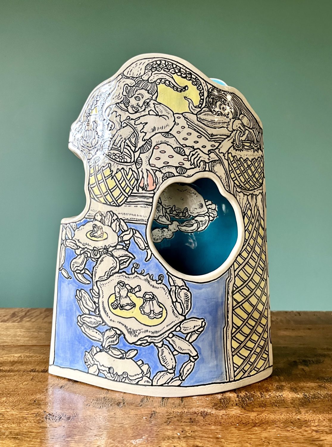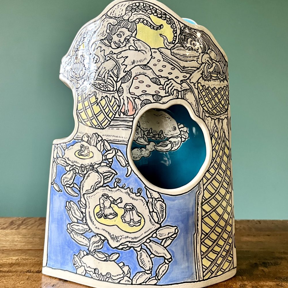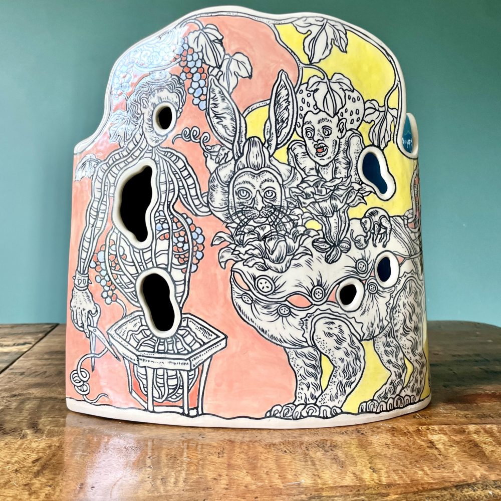 Qi Fang Colbert is a Northumberland ceramicist, artist, illustrator and PhD Fine Art. Qi specialises in hand-built original narrative and conversational mid-fire stoneware that are free-hand carved with intricate illustrations, inlaid with slip and hand-painted with underglaze. Her playful organic-shaped works interpret the relationships between humans and the natural world – informed by her personal experiences and research. Her unique free flowing approach is inspired by her Stream of Consciousness drawing and Taoism.