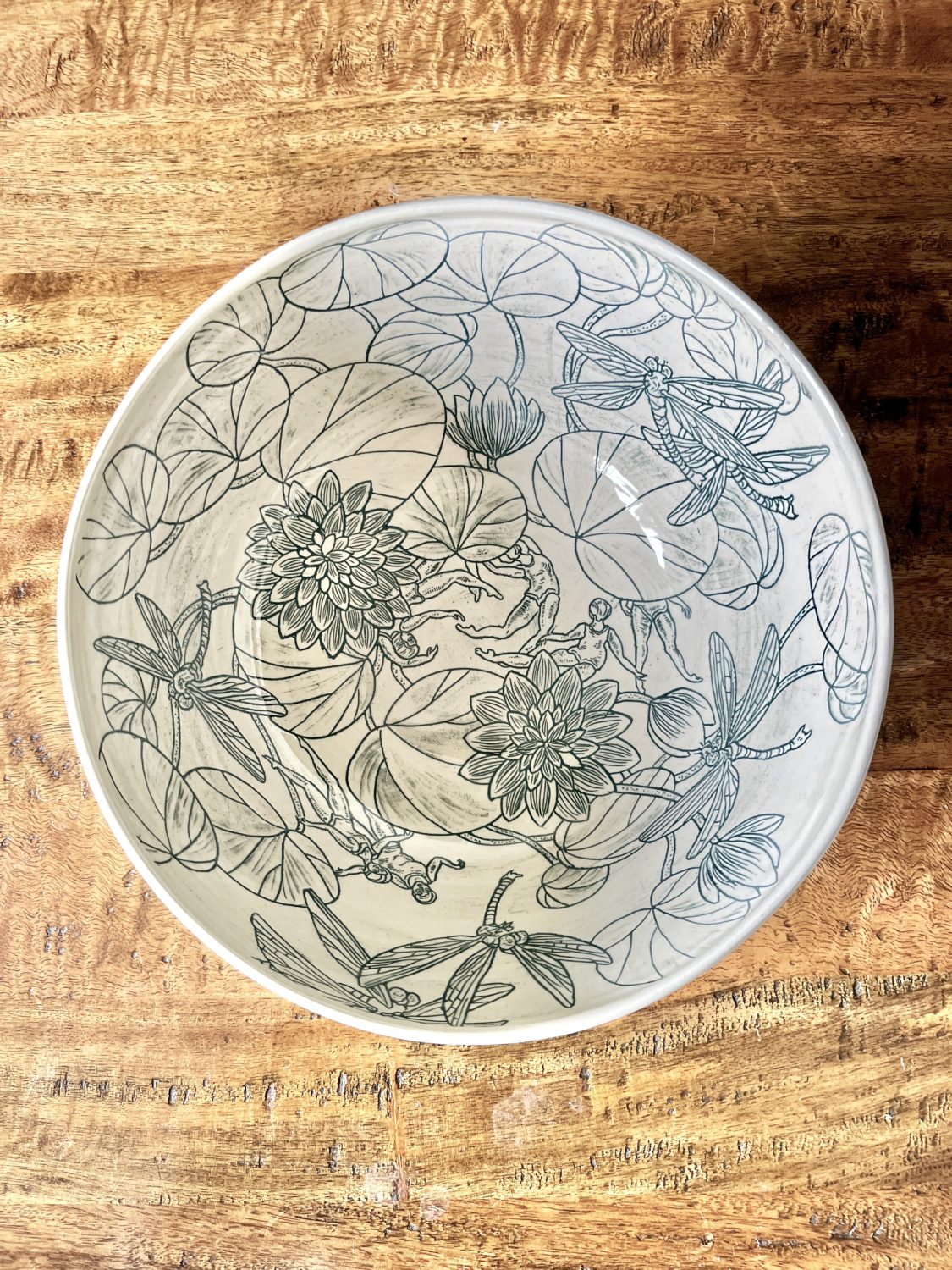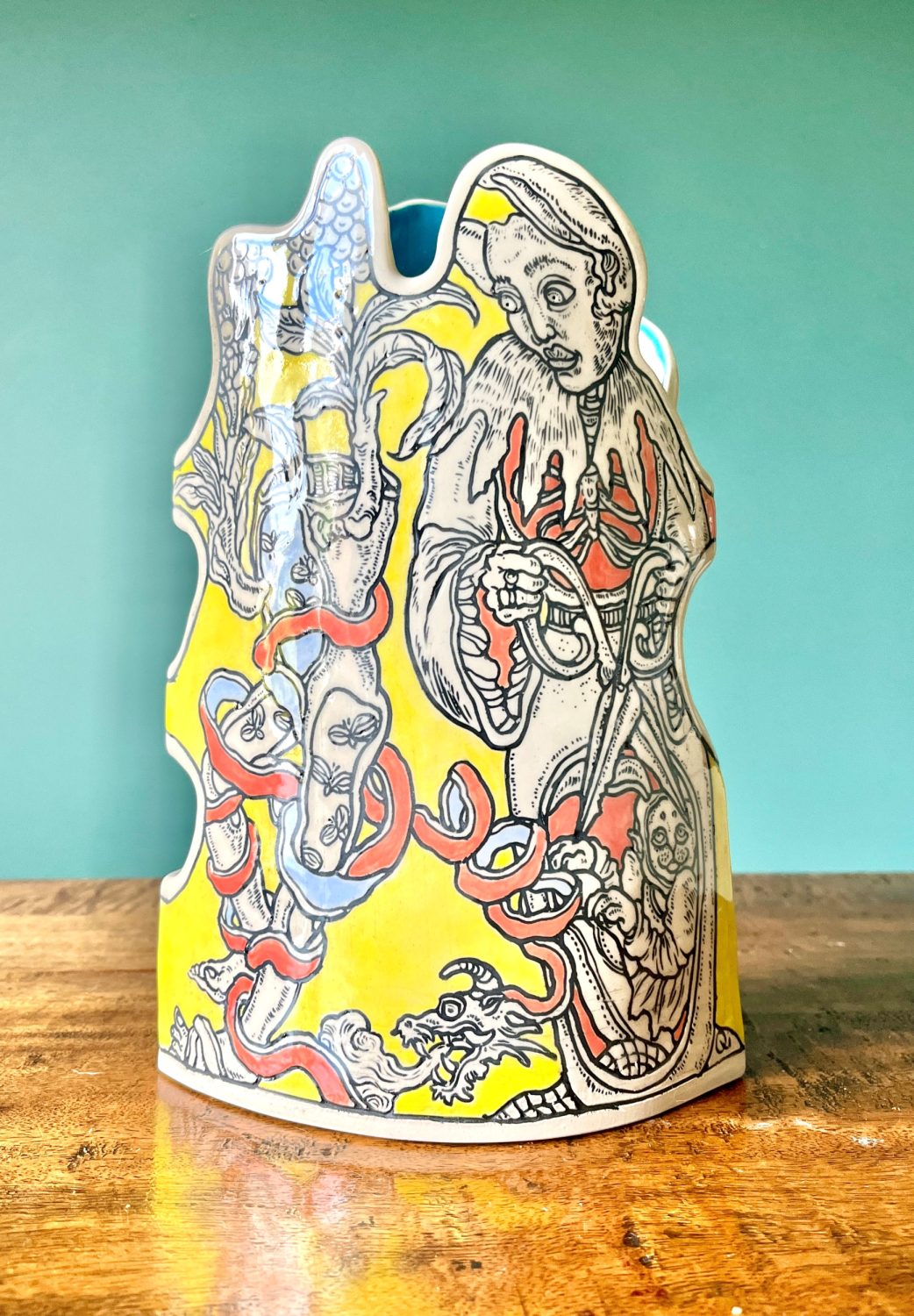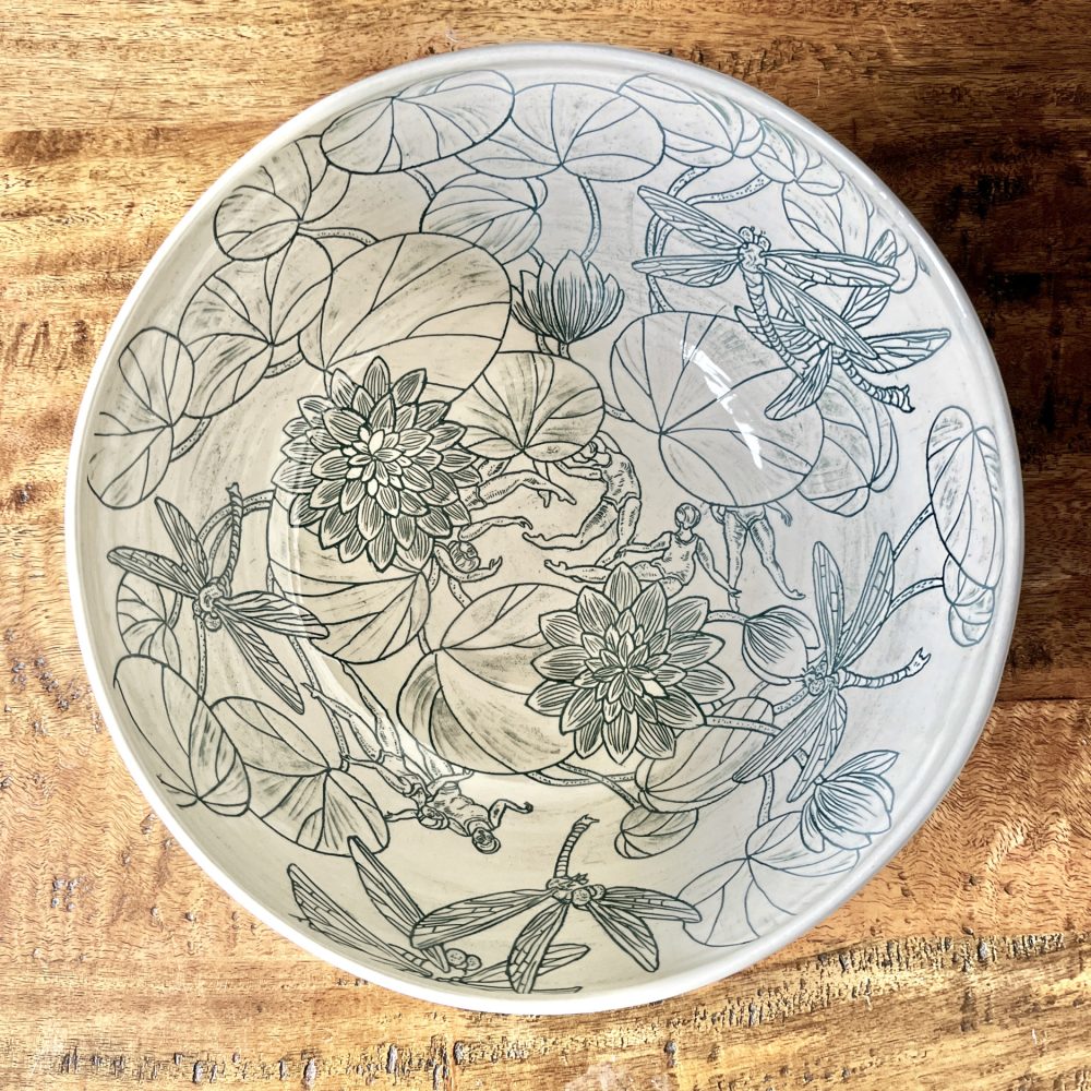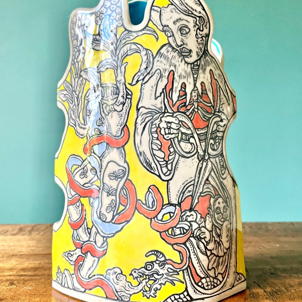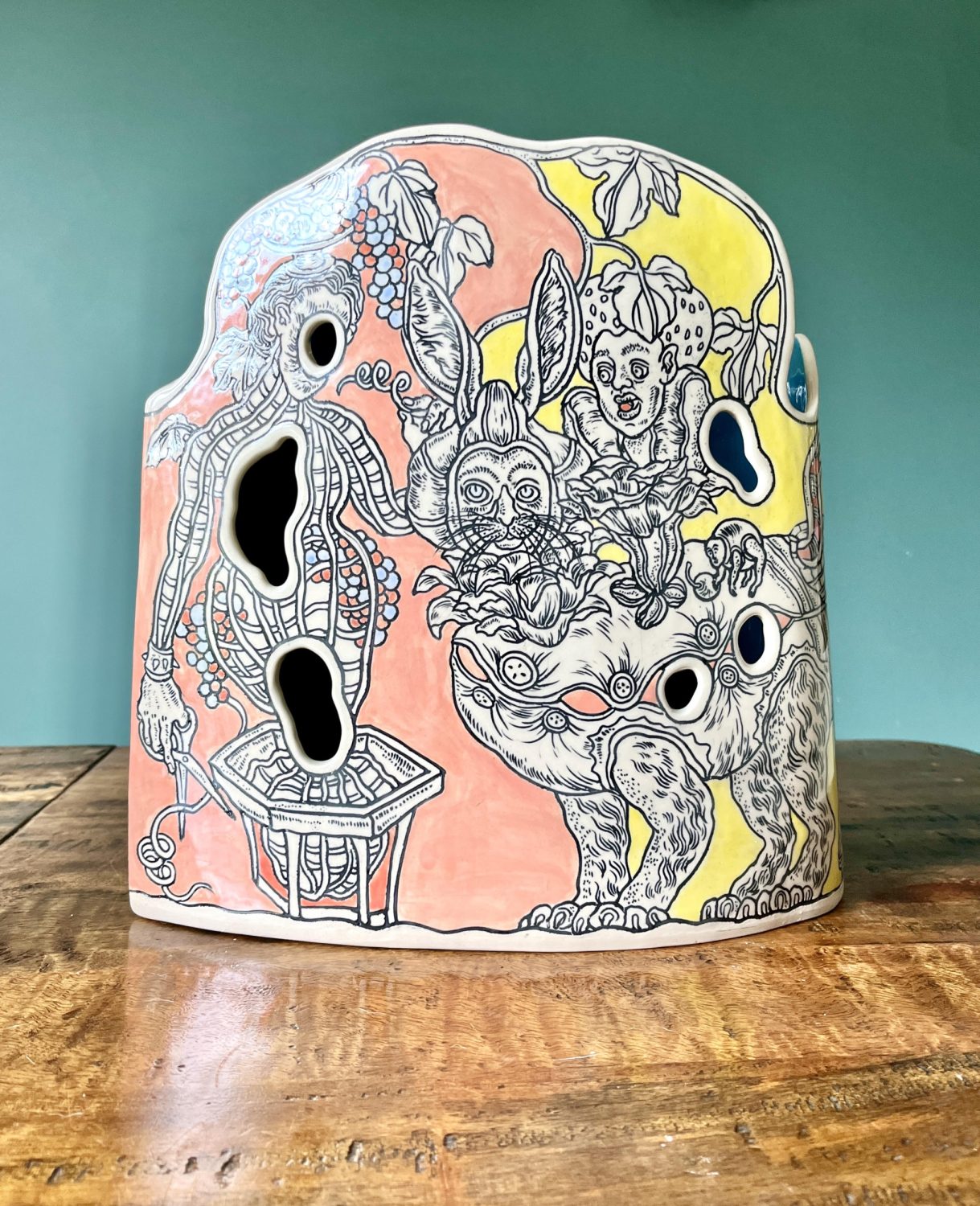 Qi Fang Colbert is a Northumberland ceramicist, artist, illustrator and PhD Fine Art. Qi specialises in hand-built original narrative and conversational mid-fire stoneware that are free-hand carved with intricate illustrations, inlaid with slip and hand-painted with underglaze. Her playful organic-shaped works interpret the relationships between humans and the natural world – informed by her personal experiences and research. Her unique free flowing approach is inspired by her Stream of Consciousness drawing and Taoism.