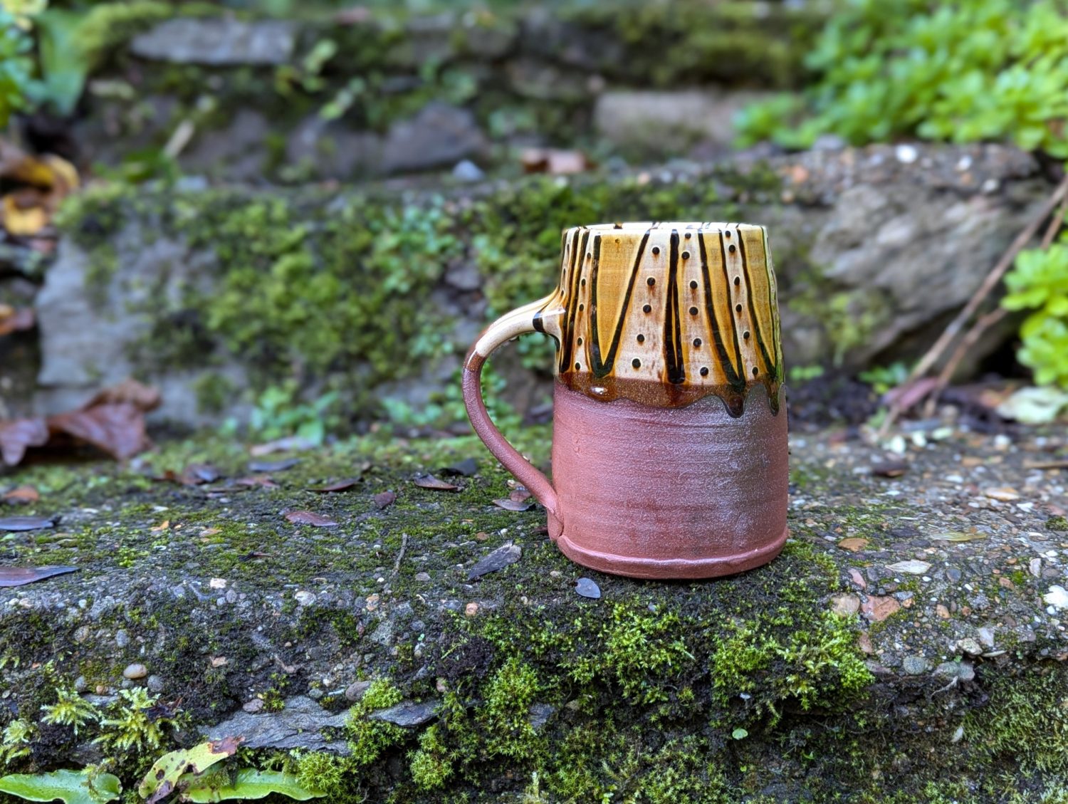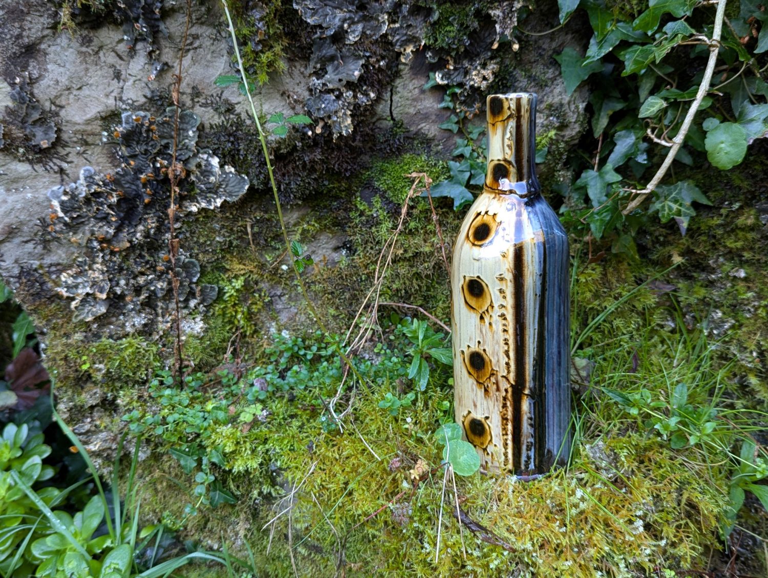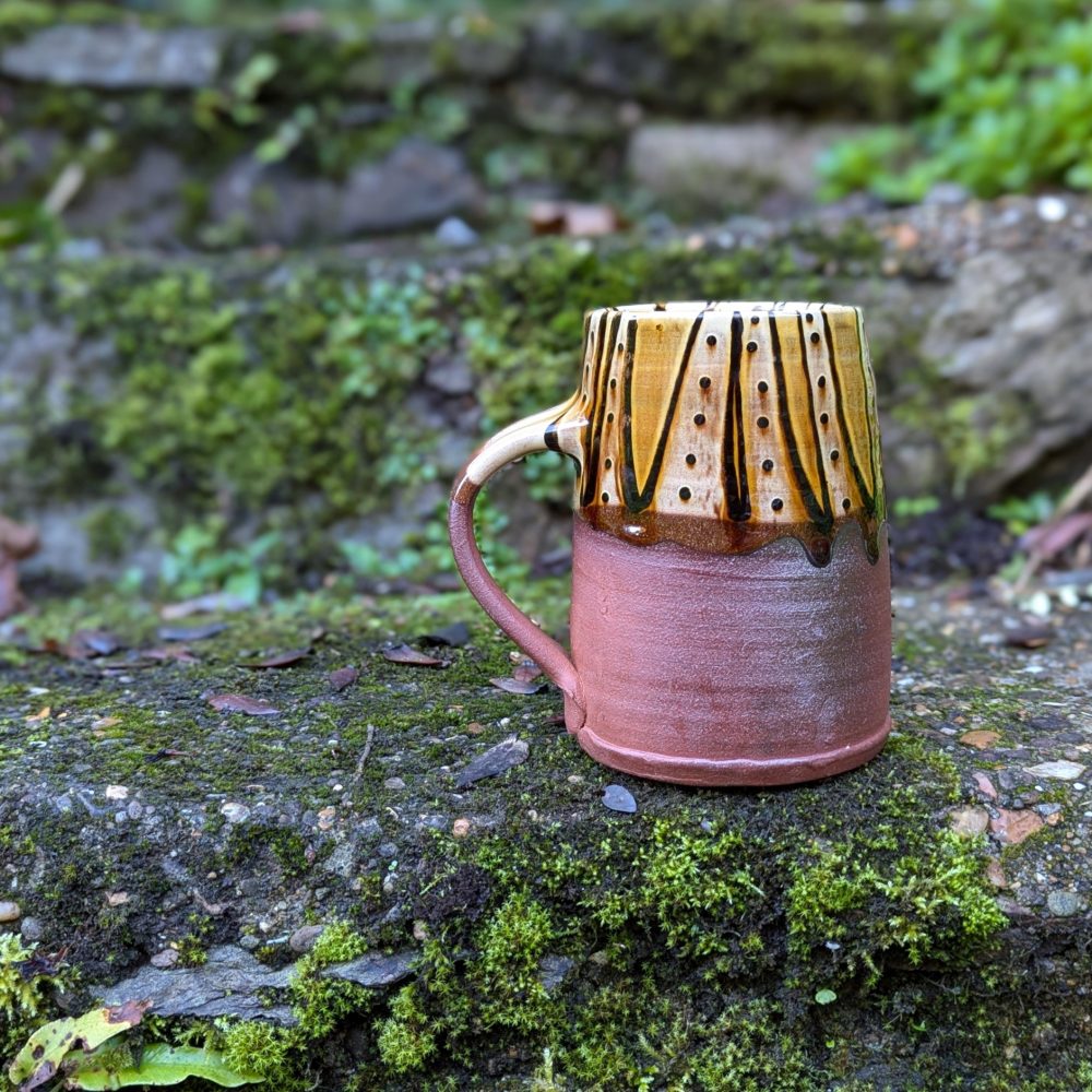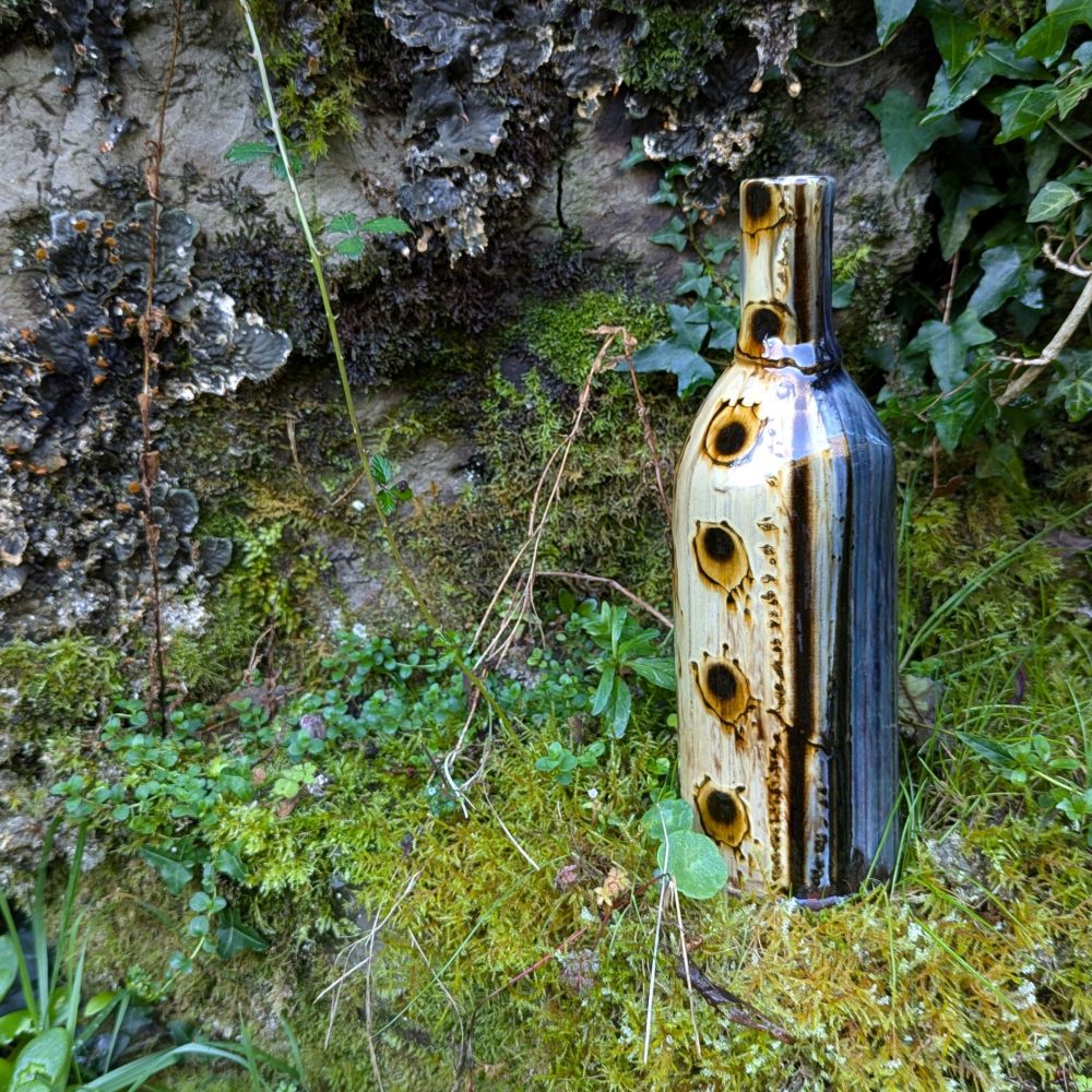 Russell’s pots are thrown, slabbed and extruded. His throwing has a human touch, he uses very few tools, making techniques aren’t hidden and nothing is turned. The slip decoration is fluid and a celebration of clay in its liquid form.