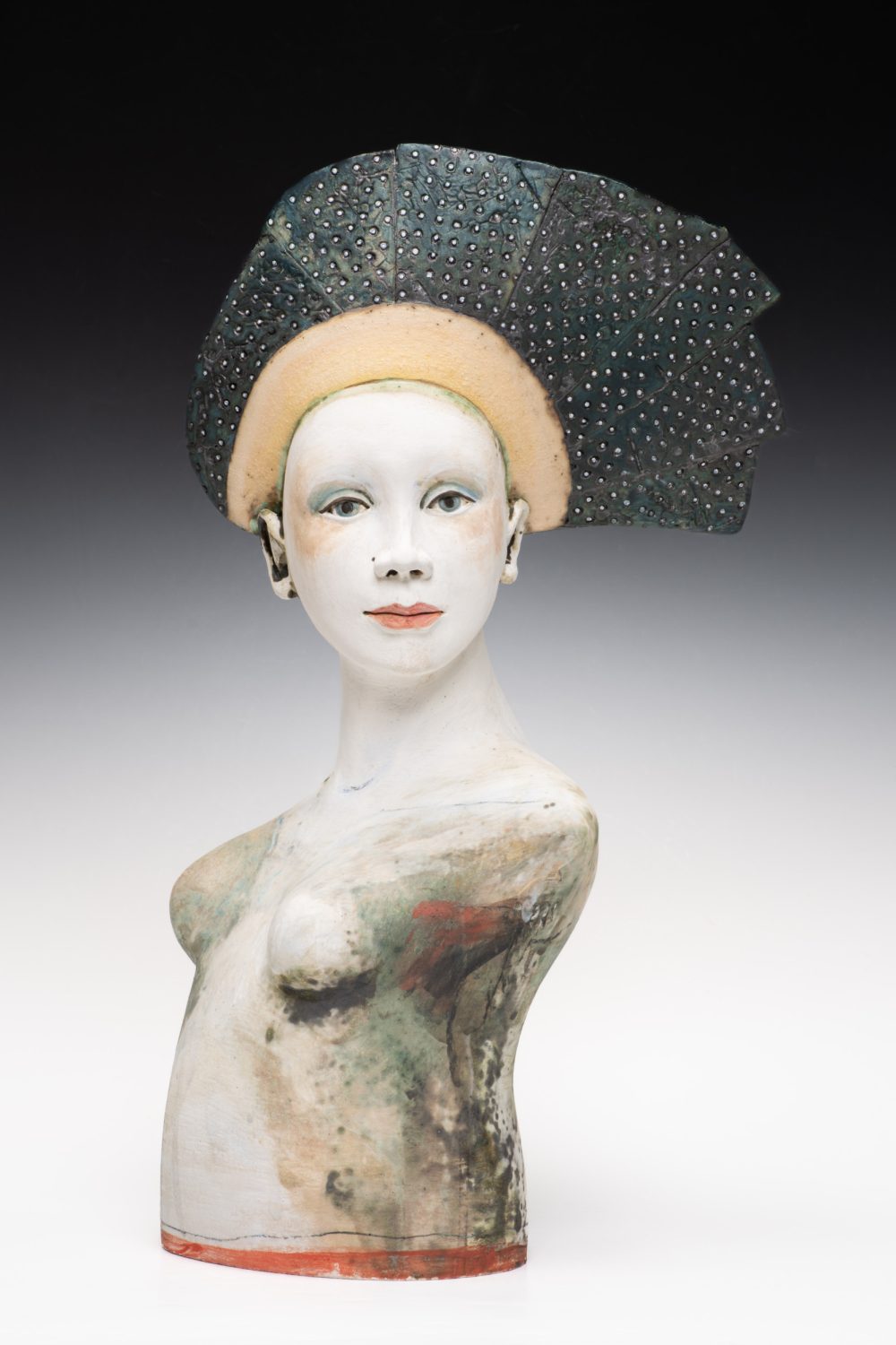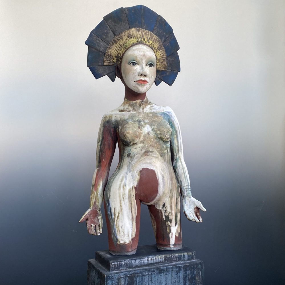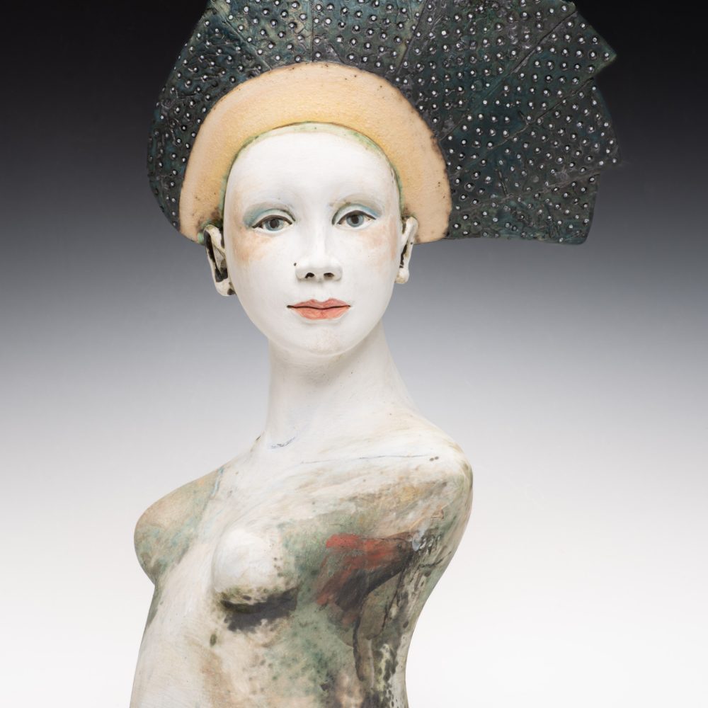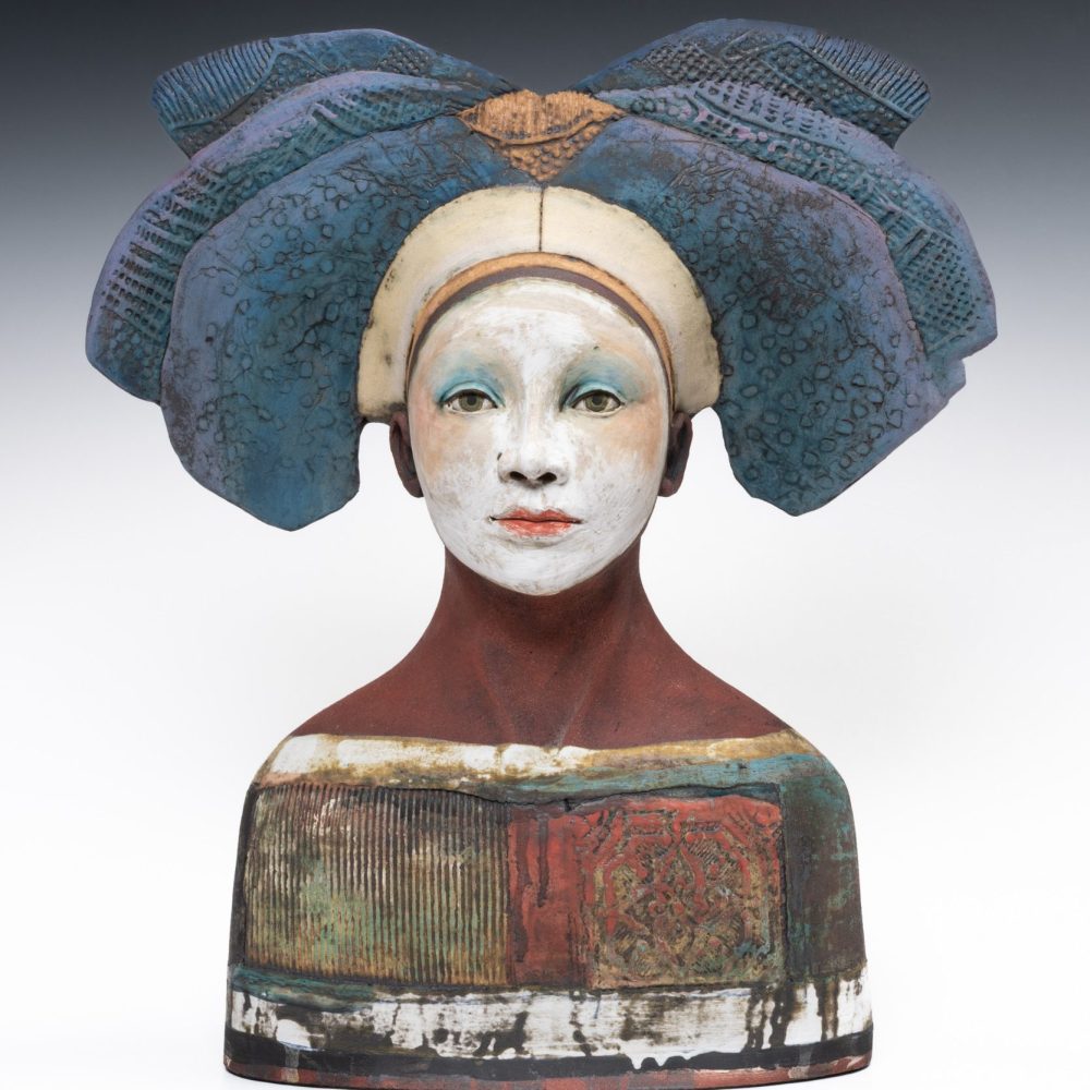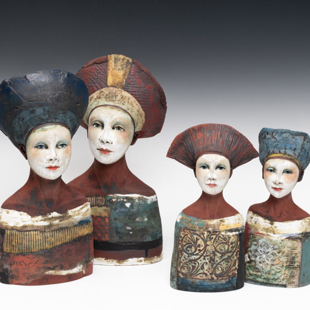 All Sally’s figures are handbuilt using slabs of clay and coils. Modelling spontaneously from the inside, squeezing and pinching the clay together, before pushing out. Layering oxides, slips, and engobes to develop complex finished surfaces that reflect the richness of human experience; Sally’s busts draw inspiration from medieval sculpture while remaining firmly rooted in the present, capturing a sense of universal humanity.