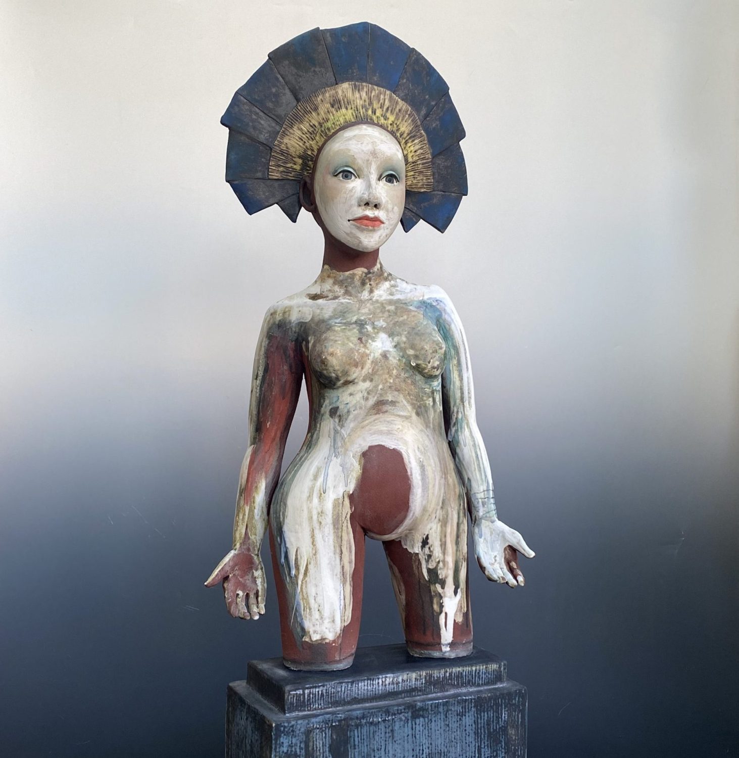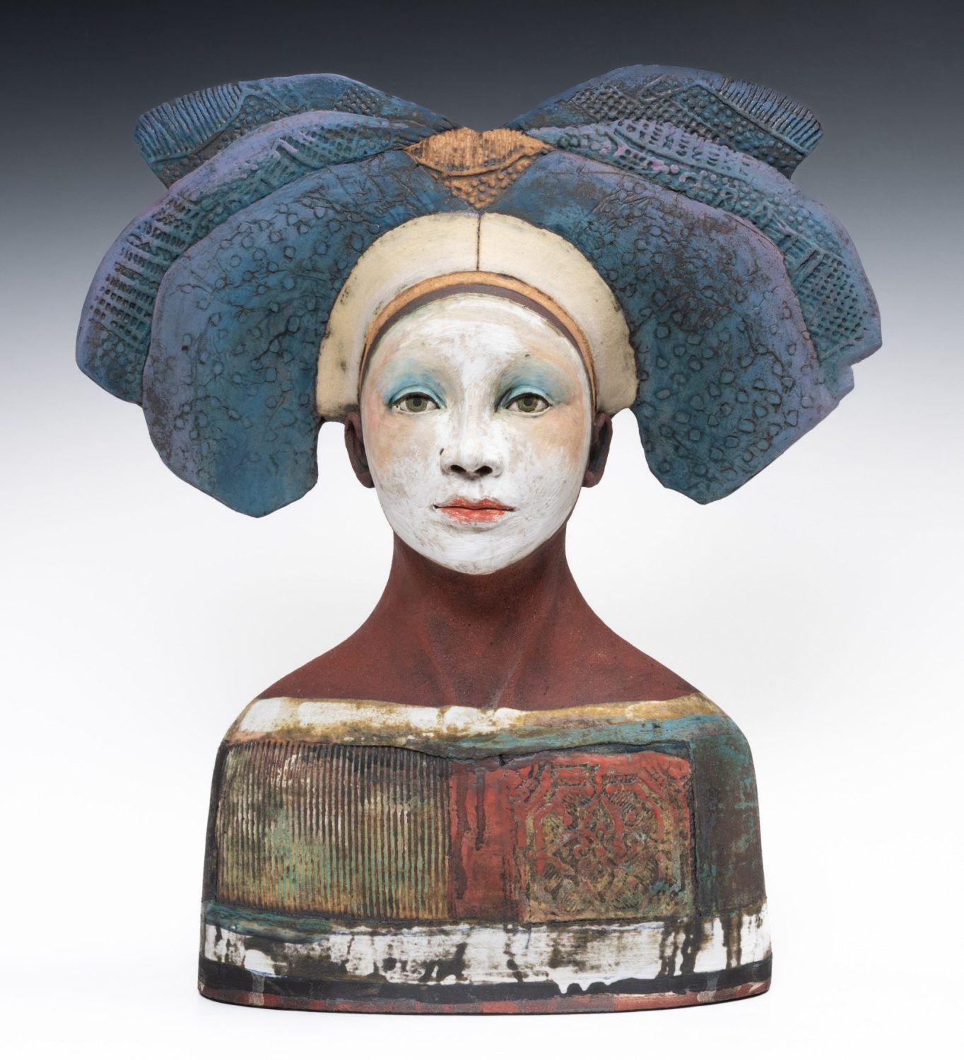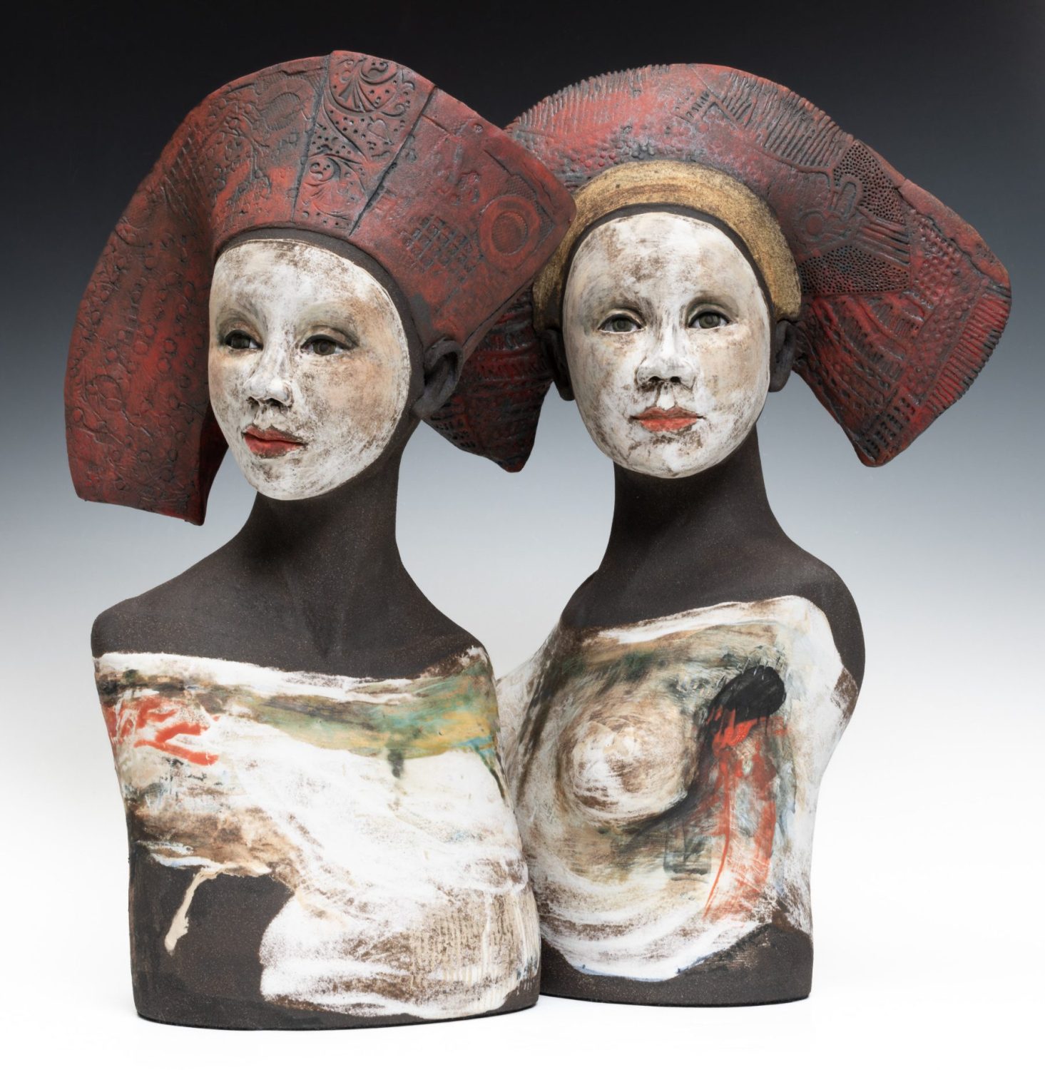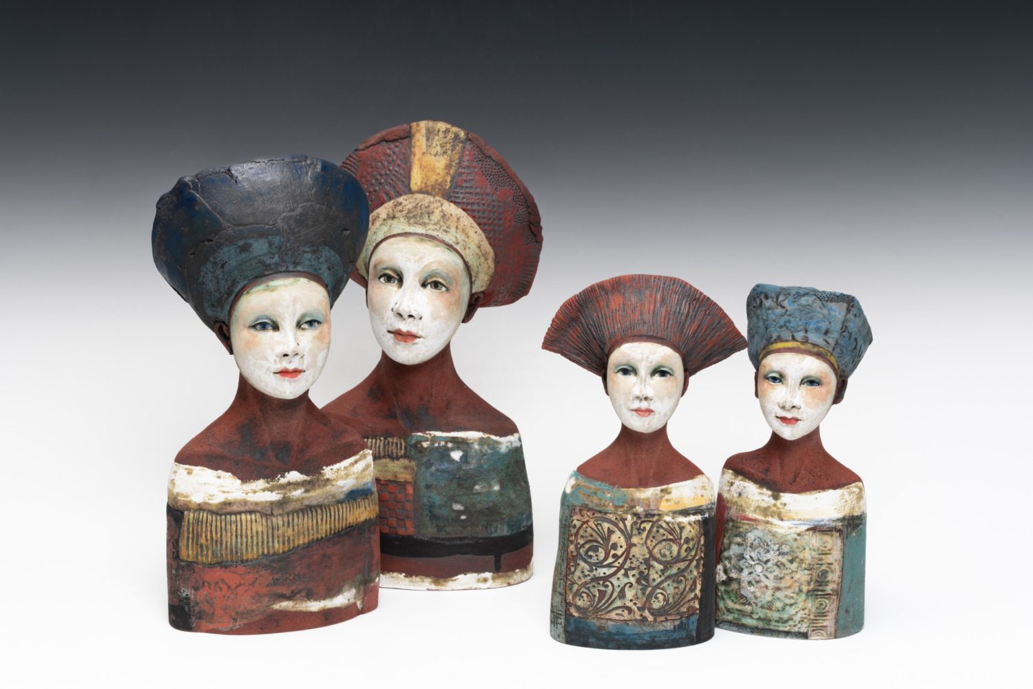 All Sally’s figures are handbuilt using slabs of clay and coils. Modelling spontaneously from the inside, squeezing and pinching the clay together, before pushing out. Layering oxides, slips, and engobes to develop complex finished surfaces that reflect the richness of human experience; Sally’s busts draw inspiration from medieval sculpture while remaining firmly rooted in the present, capturing a sense of universal humanity.