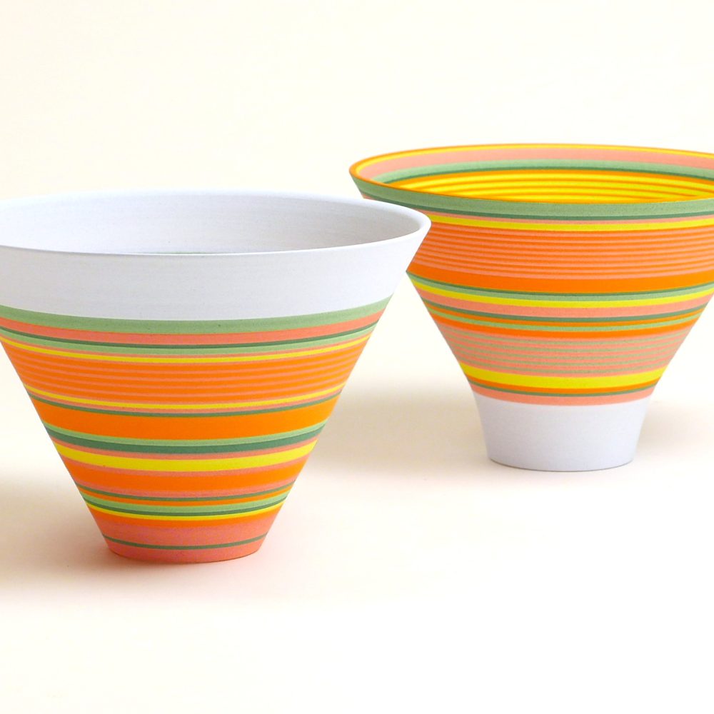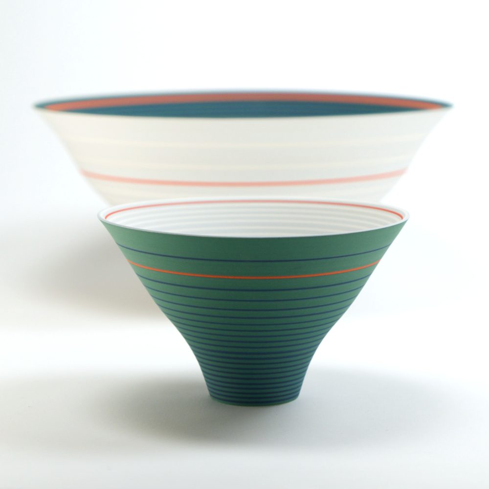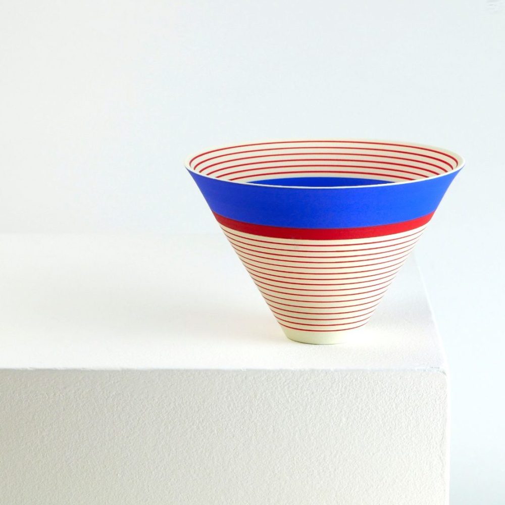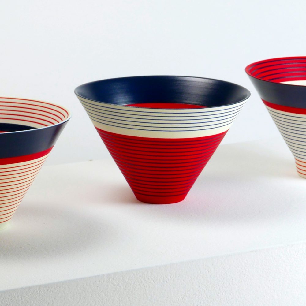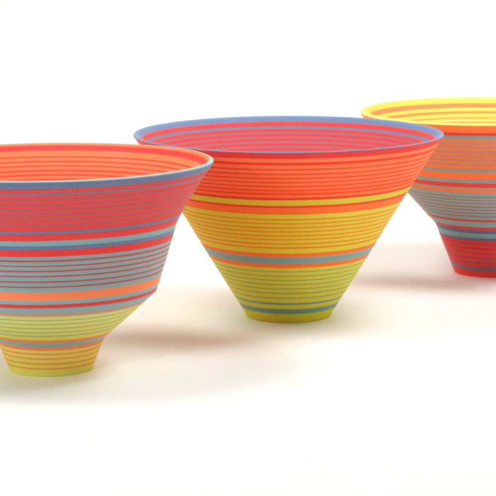 Through her work, Sara continues to explore the visual and spatial effects of colour on three-dimensional form. Underpinned by the colours in landscape scenes, Sara has recently developed a new colourway from drawings she made of the Yorkshire landscape in the summers of 2024-25. The brilliance of these colours juxtaposed with subtle areas of pale blue create parts that appear to hover with translucency and those that appear to glow. Through another colourway Sara is exploring colour relativity and illusion, whilst in others she is examining the illusory effects of gloss next to matt surfaces.
