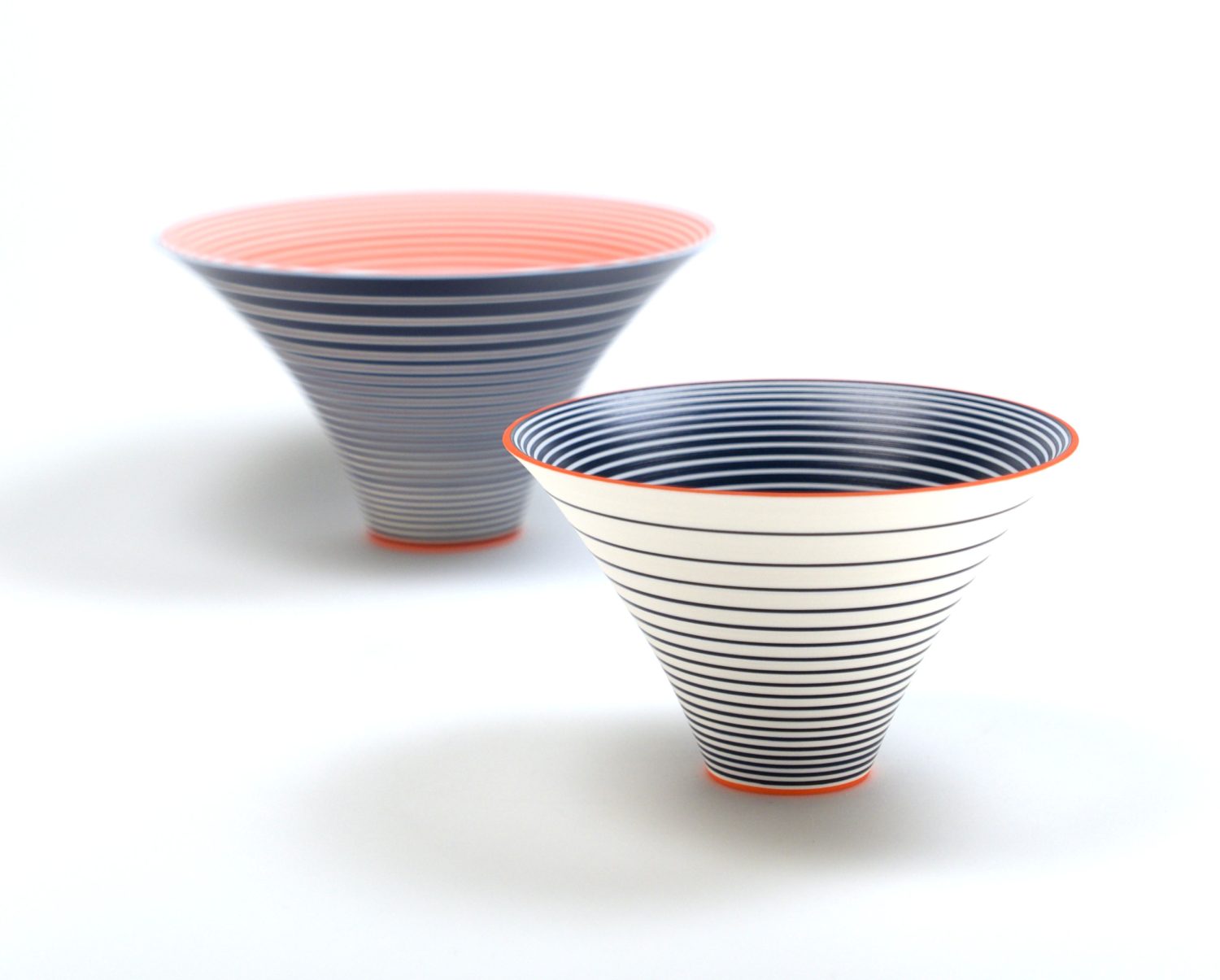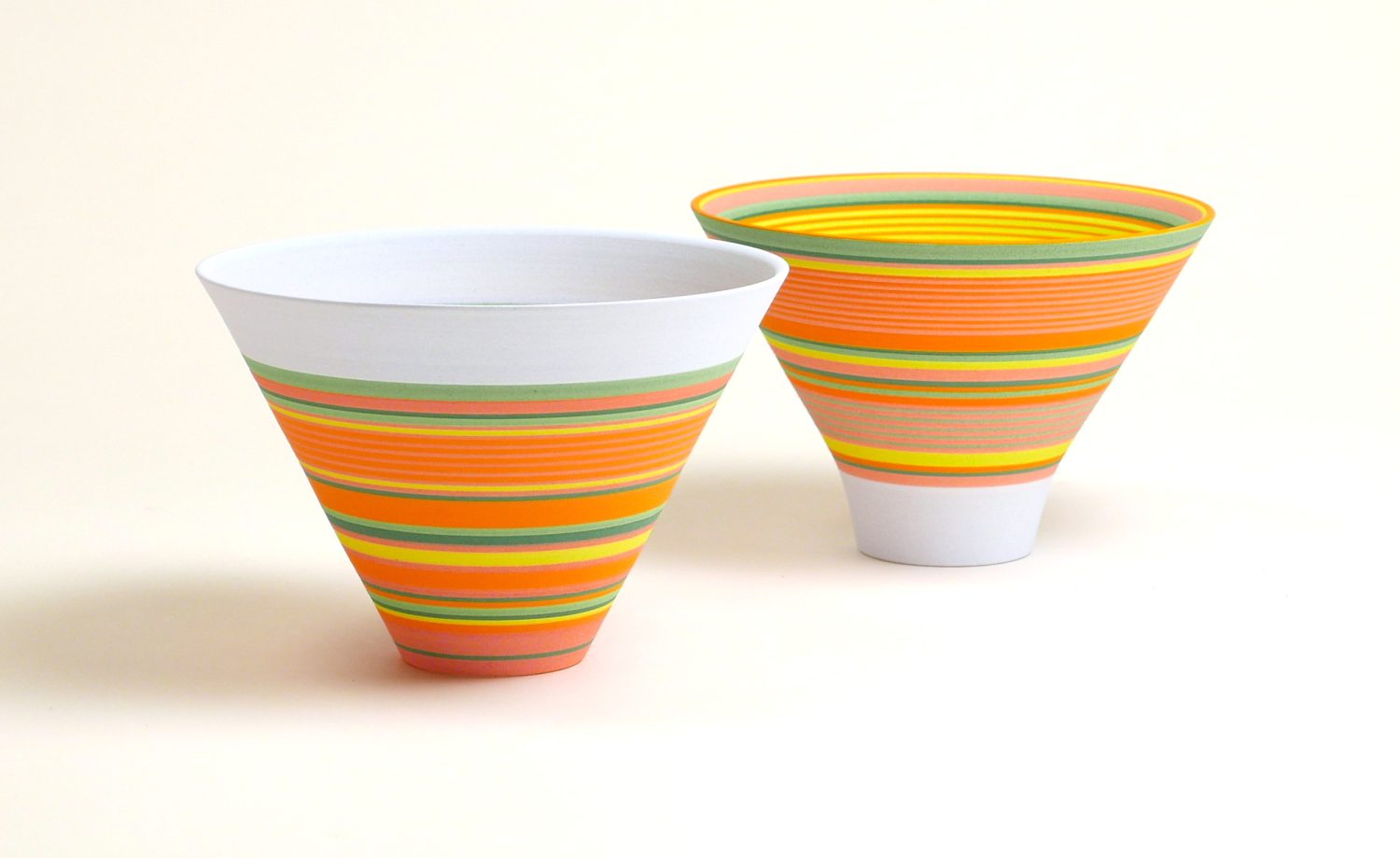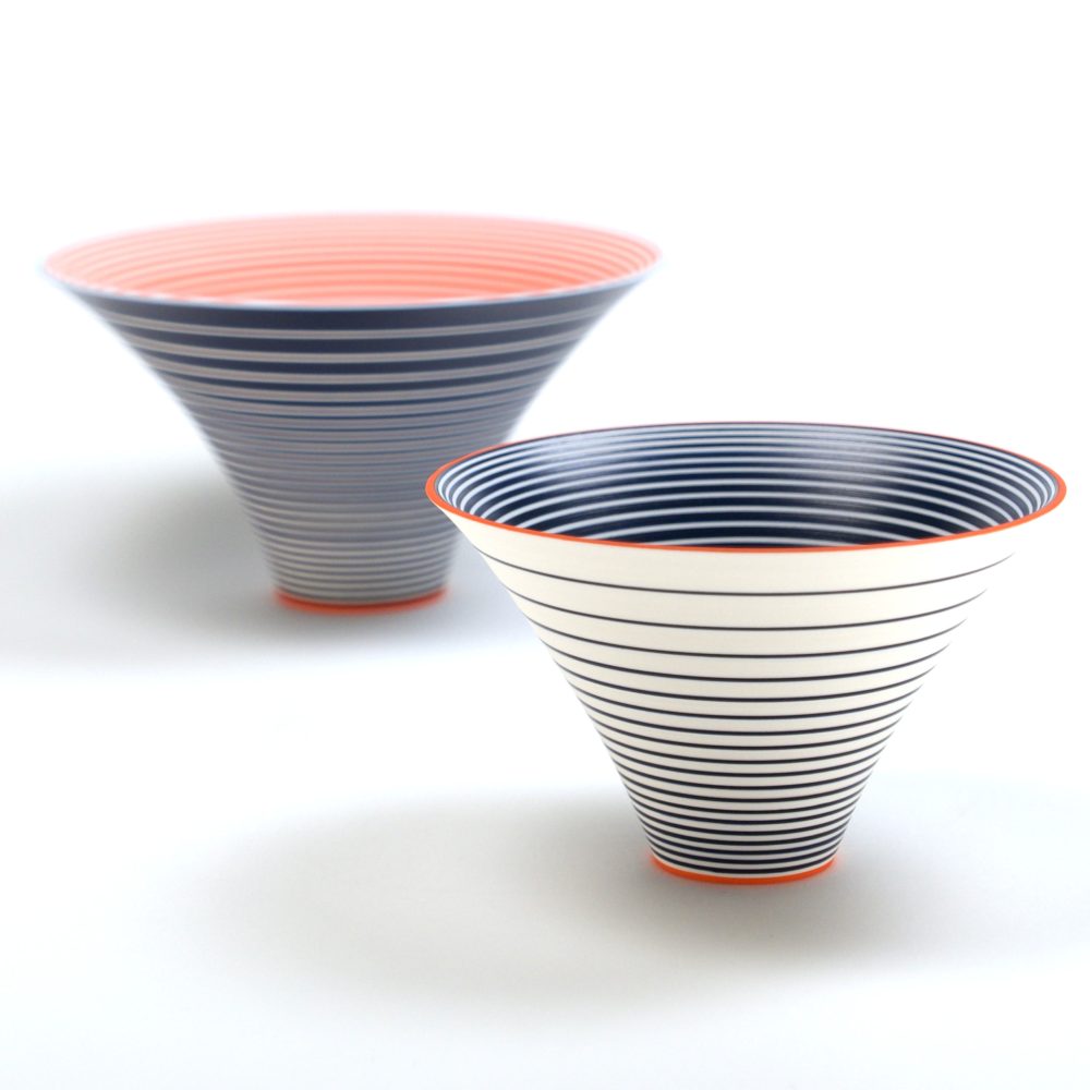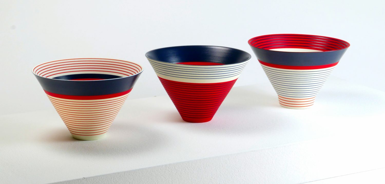 Through her work, Sara continues to explore the visual and spatial effects of colour on three-dimensional form. Underpinned by the colours in landscape scenes, Sara has recently developed a new colourway from drawings she made of the Yorkshire landscape in the summers of 2024-25. The brilliance of these colours juxtaposed with subtle areas of pale blue create parts that appear to hover with translucency and those that appear to glow. Through another colourway Sara is exploring colour relativity and illusion, whilst in others she is examining the illusory effects of gloss next to matt surfaces.