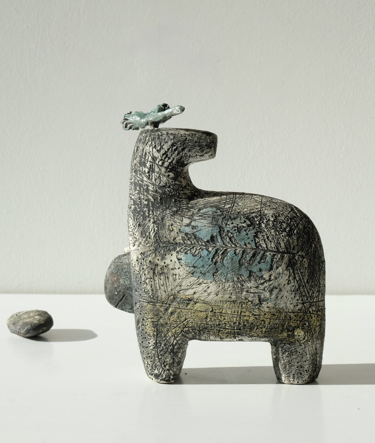 Shirley Vauvelle hand builds sculptural forms in stoneware and porcelain, exploring balance of form and the subtle character created through the smallest additions or removals. Many of her pieces are built with inserts and components that can be altered, allowing the composition of a piece to shift and evolve. She creates a sculptural world inhabited by Carrier Beasts, Land Seekers, Lookers, Flower and Seed Thinkers, and Warriors, coexisting with plants, fish and birds under one universal sky. Each piece encourages discovery, offering narrative and individuality within carefully considered form.