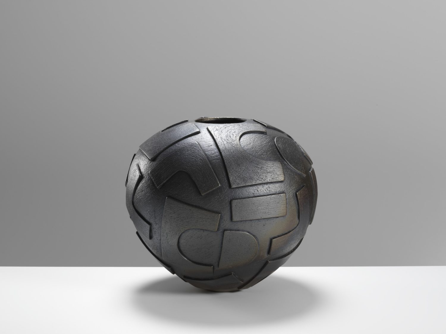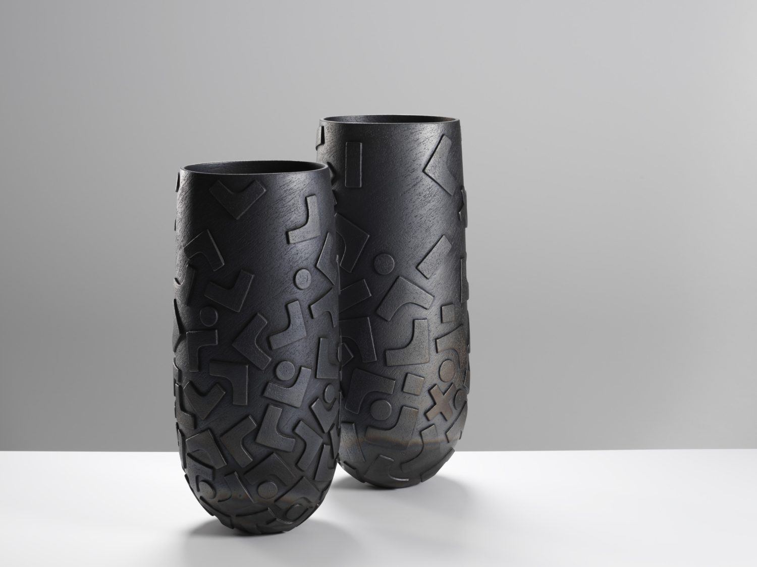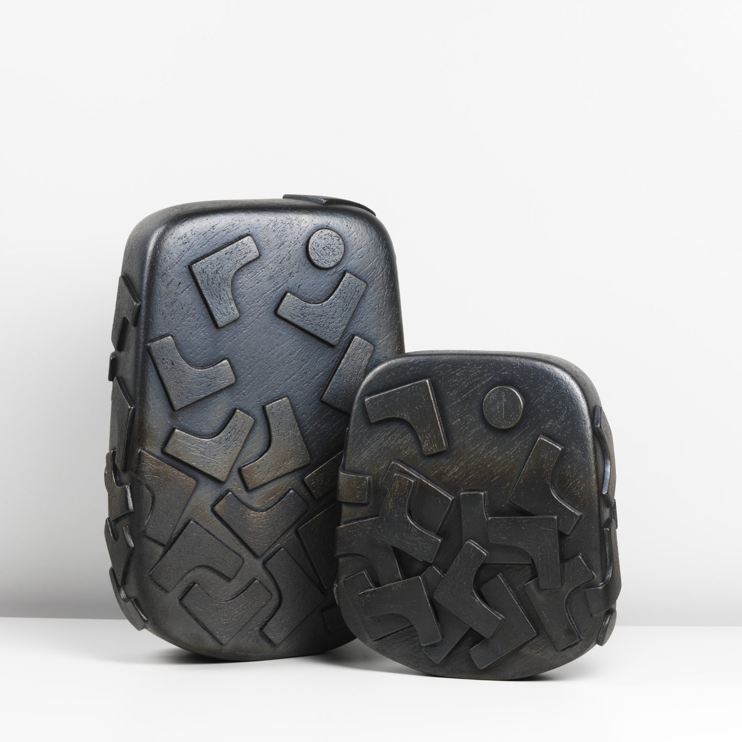 After an initial firing in an electric kiln, her pieces undergo either saggar or raku firing, which enhances their surfaces with atmospheric depth and unpredictability.