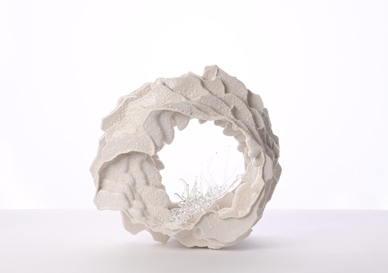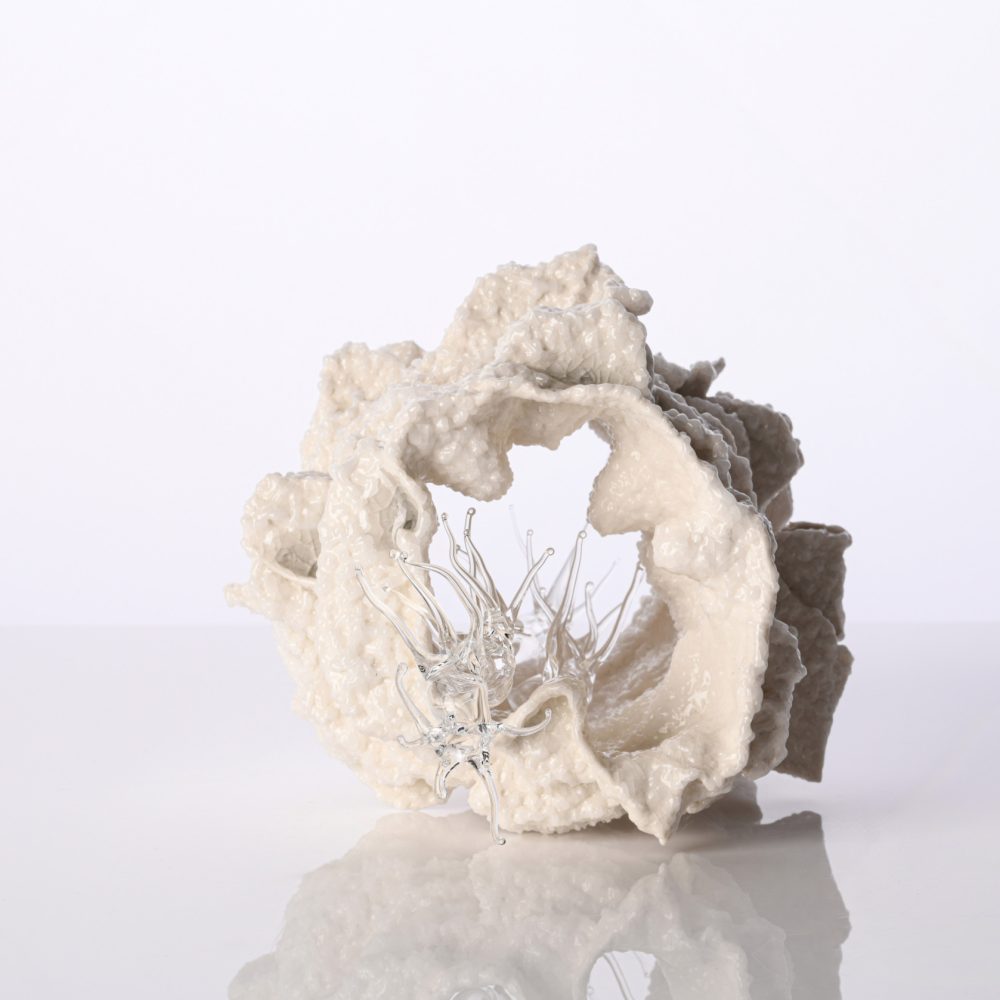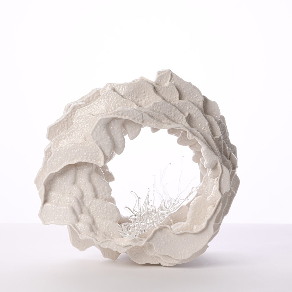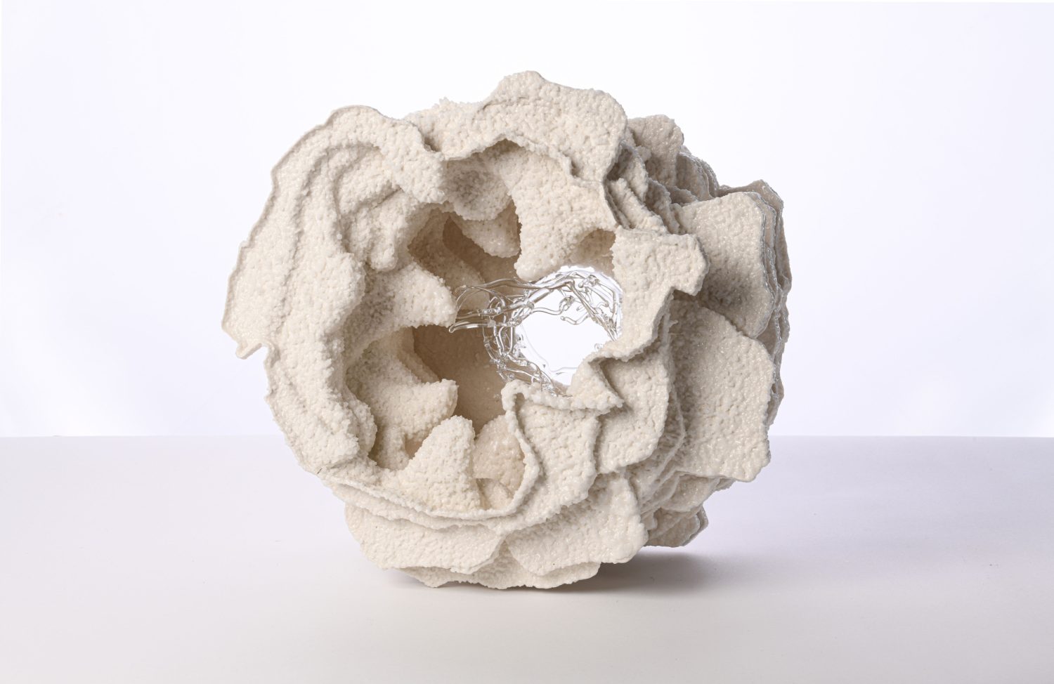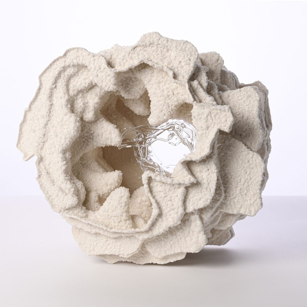 Valerie Bernardini creates sculptural works in porcelain, where fragility, transformation, and balance take form through complex organic structures and experimental glazes. Inspired by the fluidity of the sea, her pieces embody both stillness and movement, conjuring sensations of shifting tides and quiet resilience. While porcelain is at the heart of her practice, Valerie extends its dialogue with glass to explore contrasts of solidity and lightness, opacity and transparency. Her work invites reflection on nature’s cycles and the harmony found within fragile forms, offering intimate, contemplative sculptures that resonate with both material depth and poetic sensibility.